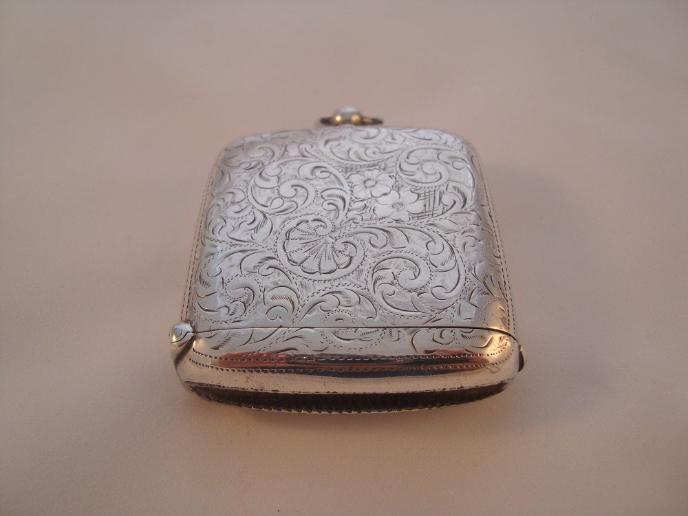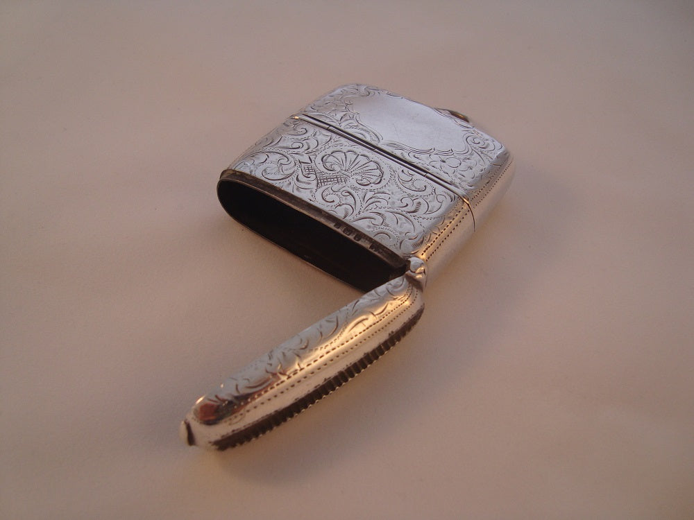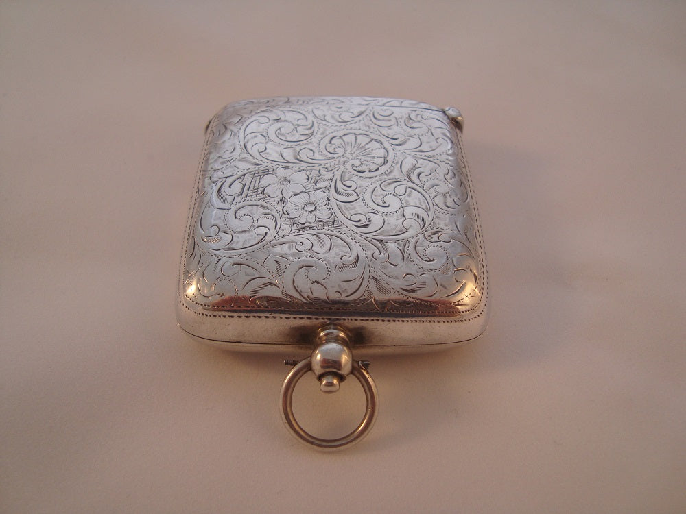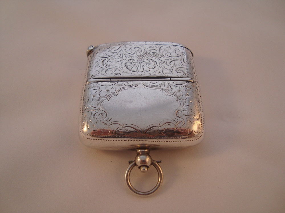 An unusual combination vesta and sovereign holder. The sovereign holder is designed to hold a full sovereign and a half sovereign. This case has an all over engraved decoration with a central unengraved cartouche on the sovereign holder section. The decoration is really crisp and still sharp with very little wear. The hallmarks are clear. A lovely and unusual collectable item of Edwardian silver.