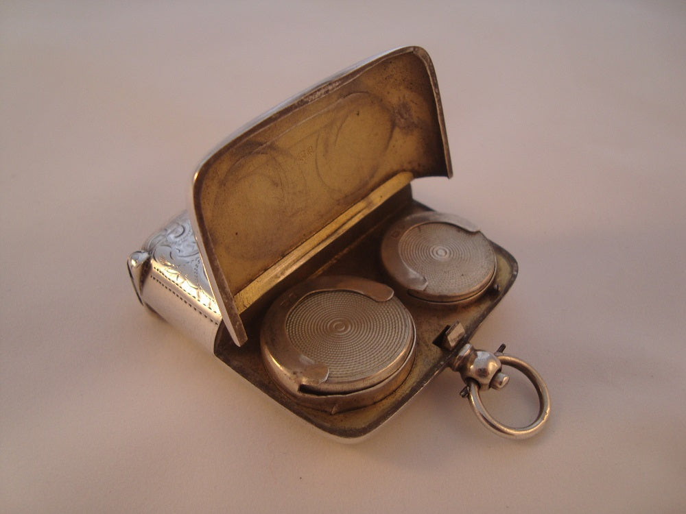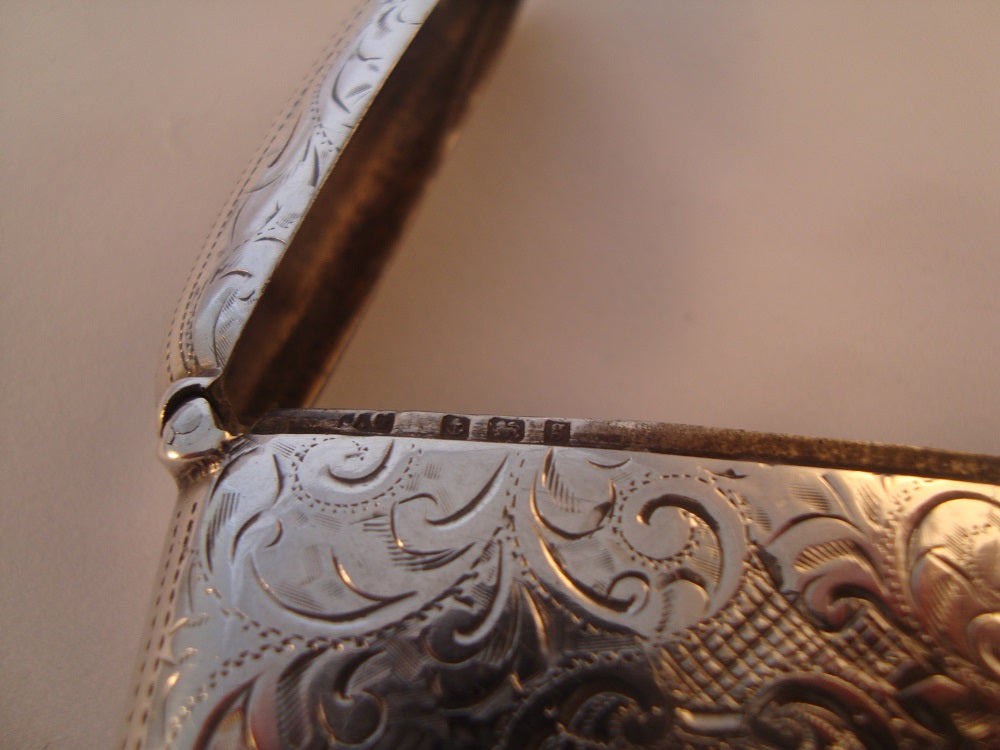 Very good with a couple of miniscule dents / marks to the sides. There is one very small dent in the cartouche. There is very little wear to the decoration, the only area showing some wear is the cartouche which has a few very minor scratches which are commensurate with age and use. The vesta closes snugly. Both hinges are good with no repairs, The spring loaded sovereign holder works well and closes well. The striker is good. Hallmarks are clear on the vesta section, inside the lid of the sovereign holder, and on the holders themselves. Overall a lovely quality collectable item of silver showing minimal signs of age and use related wear.