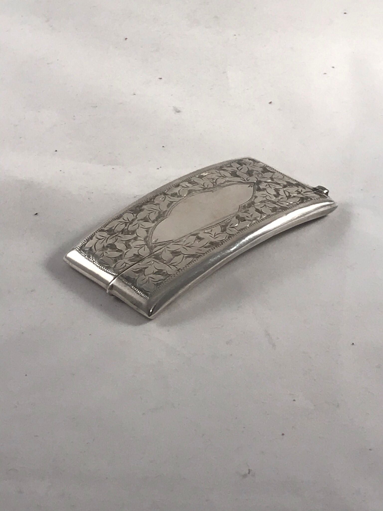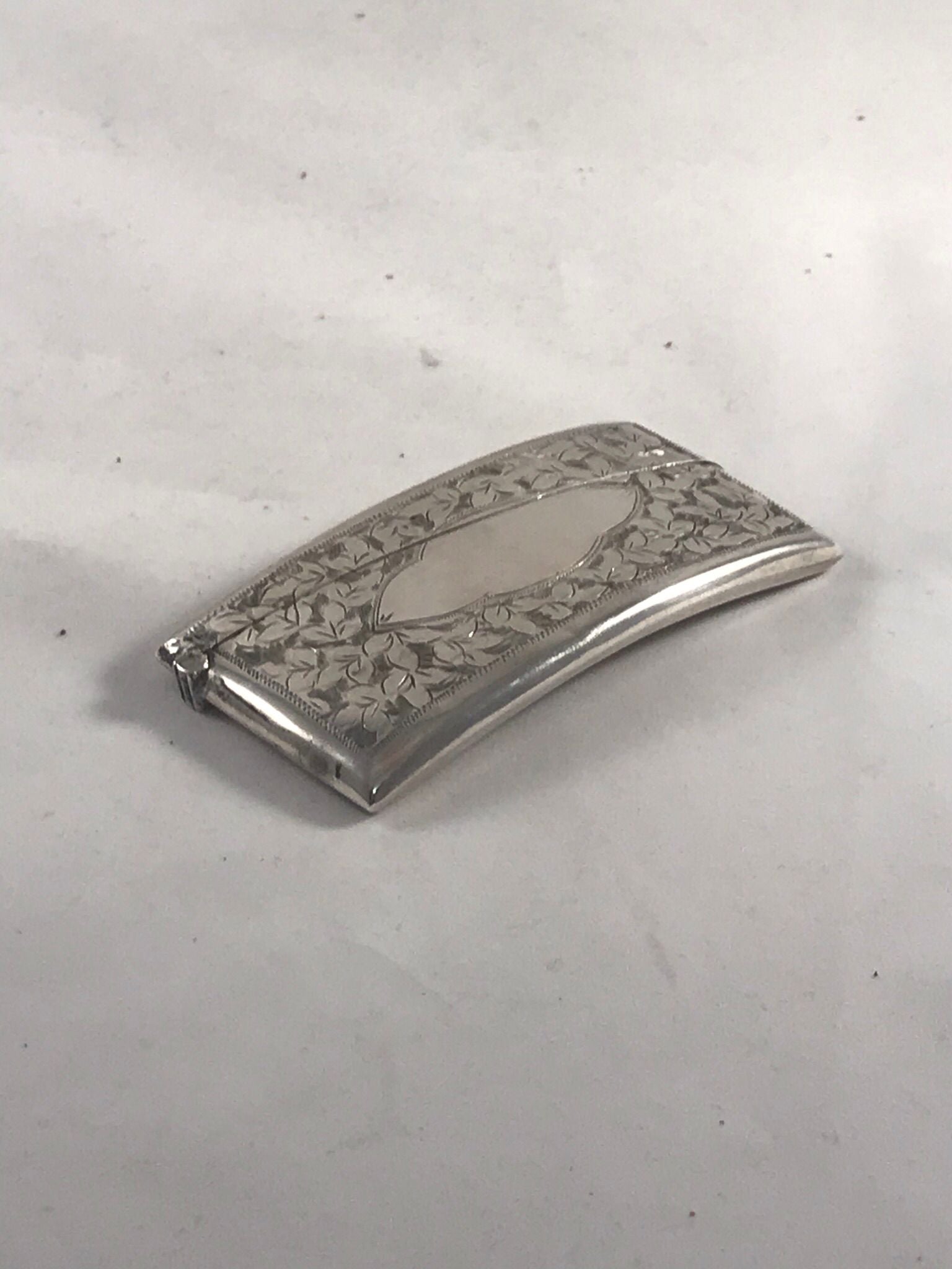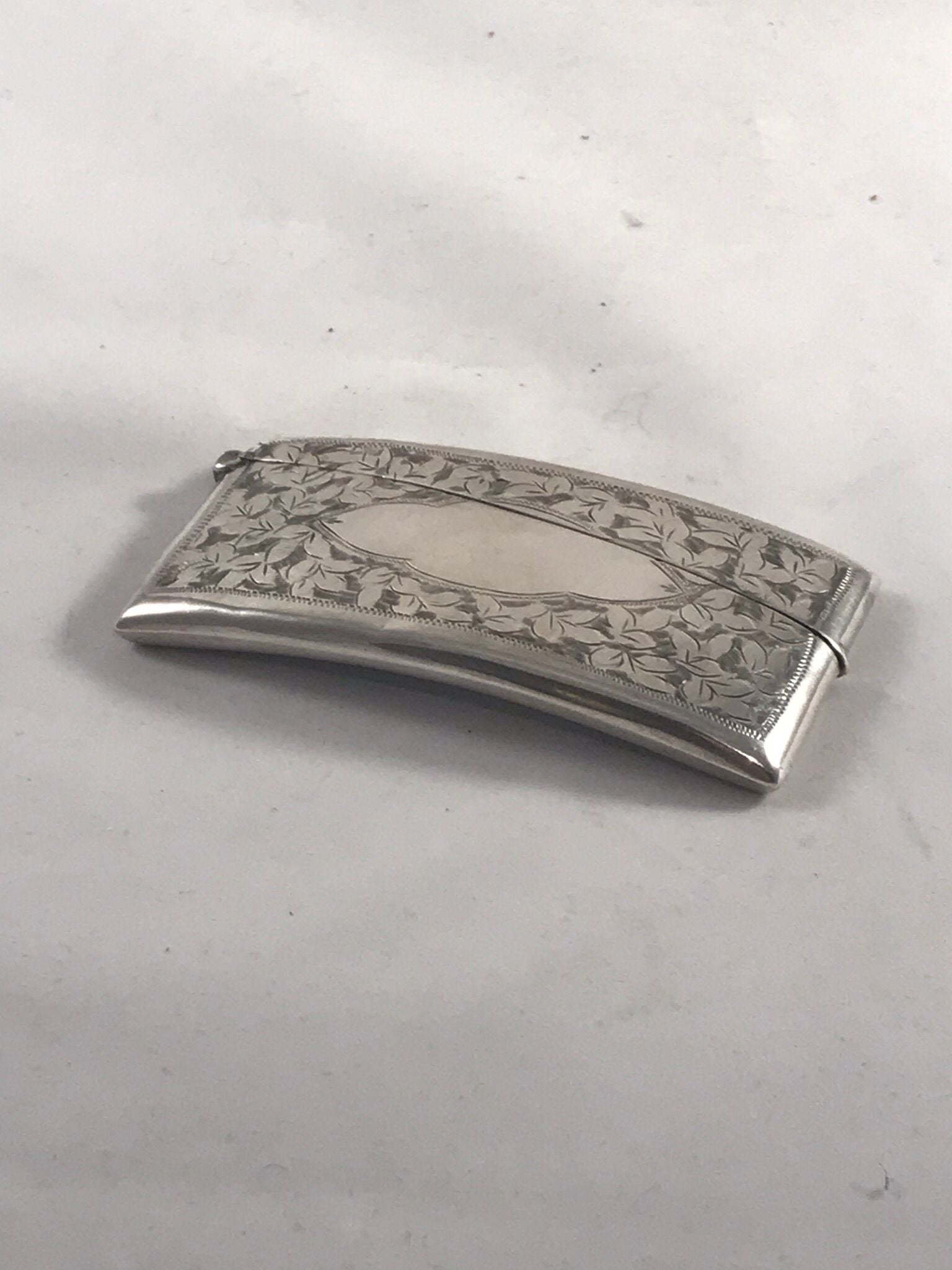 A really striking Edwardian silver curved card case. This has an all over Ivy leaf decoration which is really unusual and striking. It has a shaped cartouche to the front which is unengraved. A really beautiful example of an piece of collectable silver from the Edwardian period.