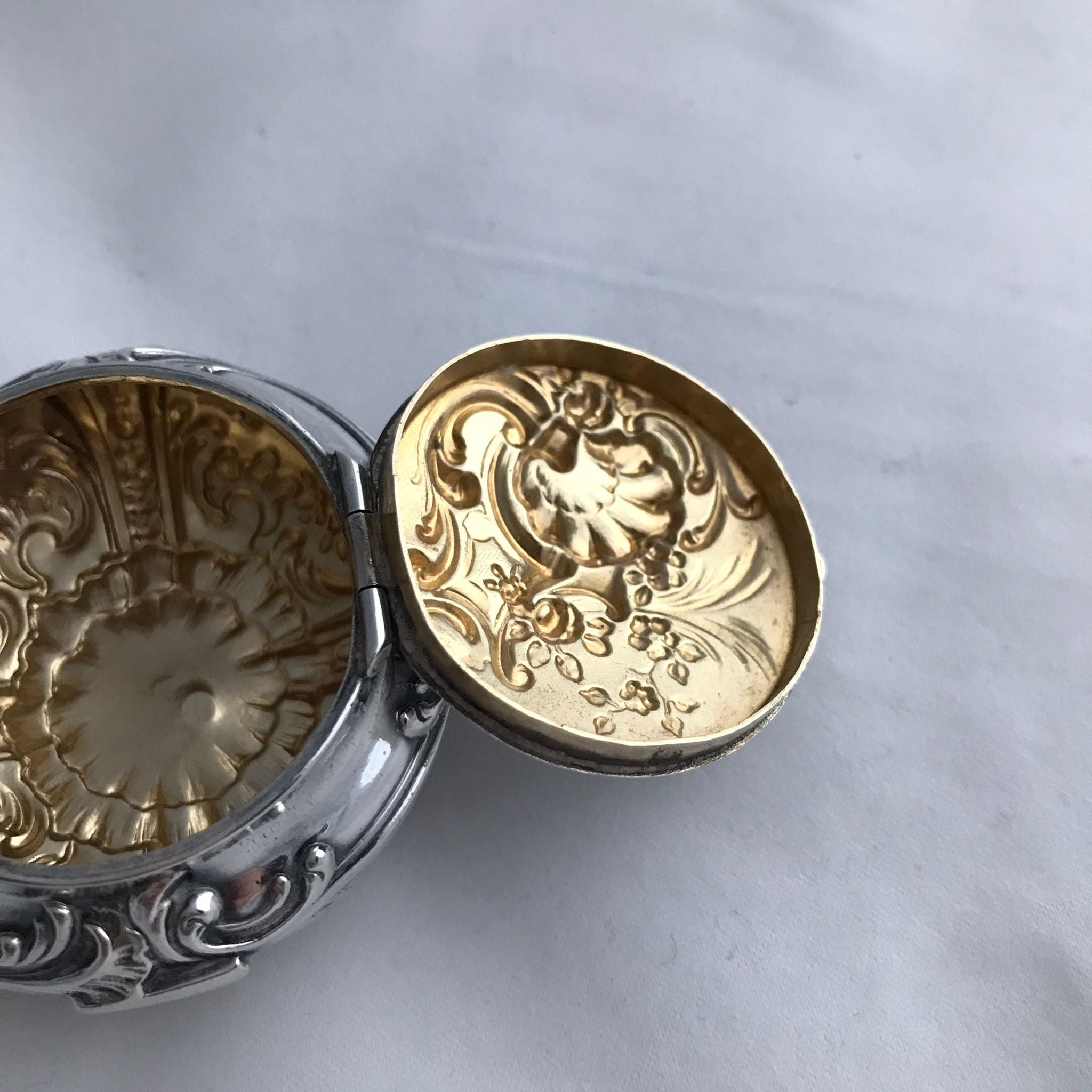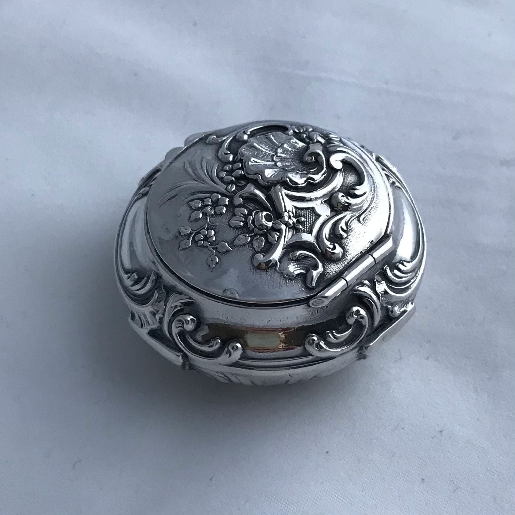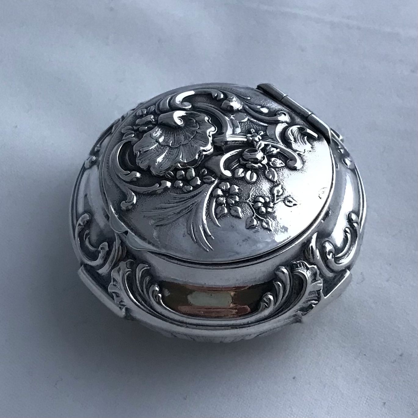 A French solid silver box with embossed decoration to sides, lid and base. The lid is hinged and flips open. The lid opens to reveal a gilded interior. There are French Silver marks on the base.