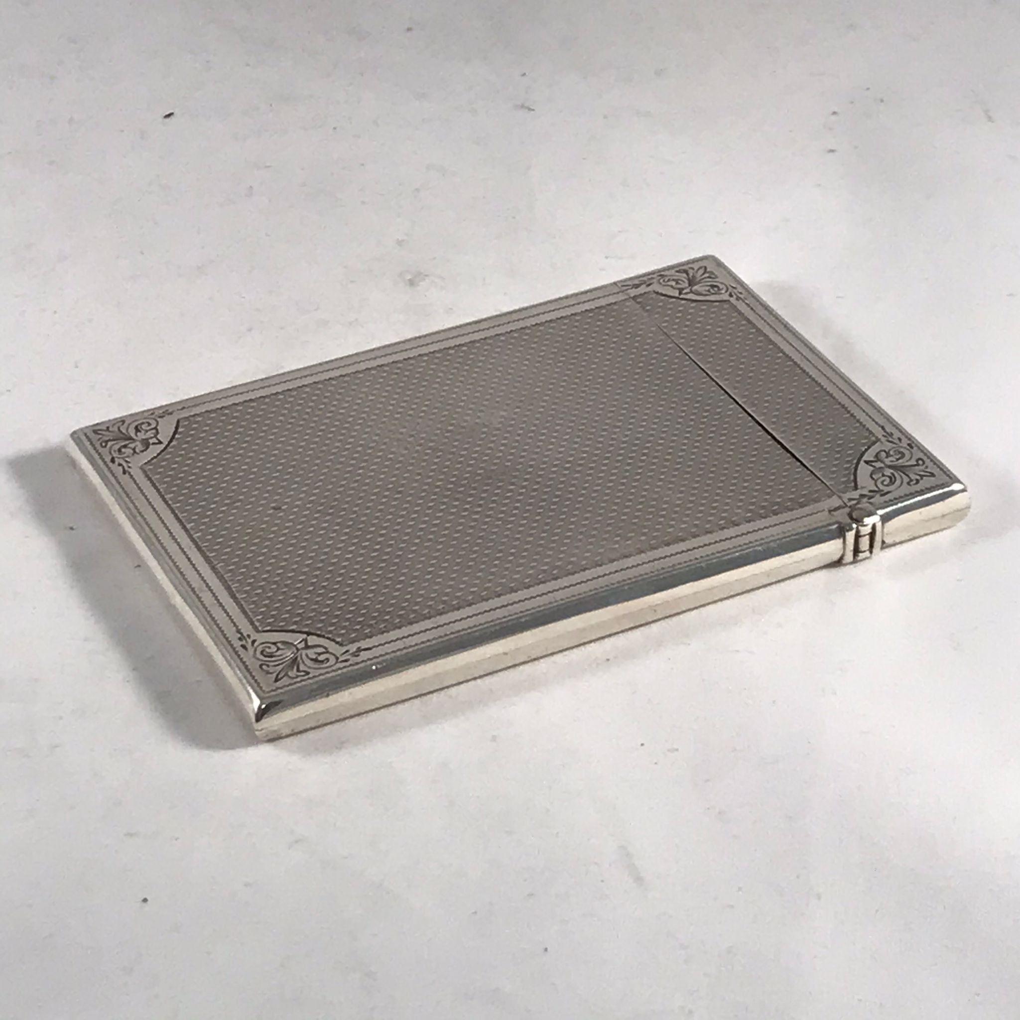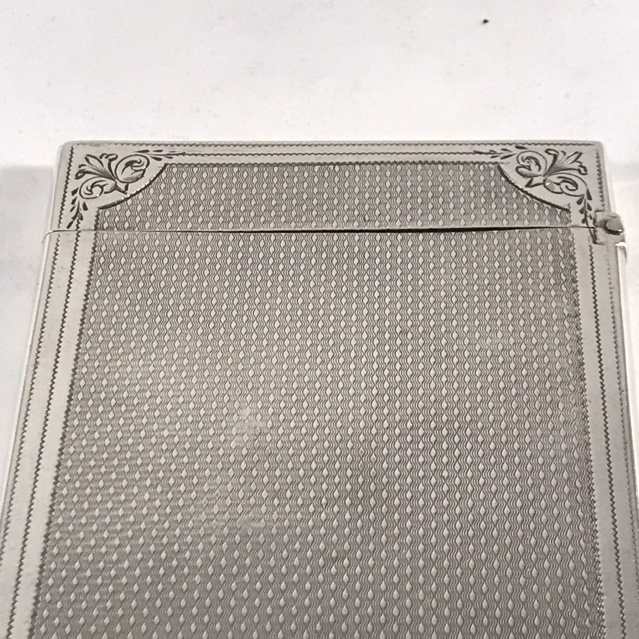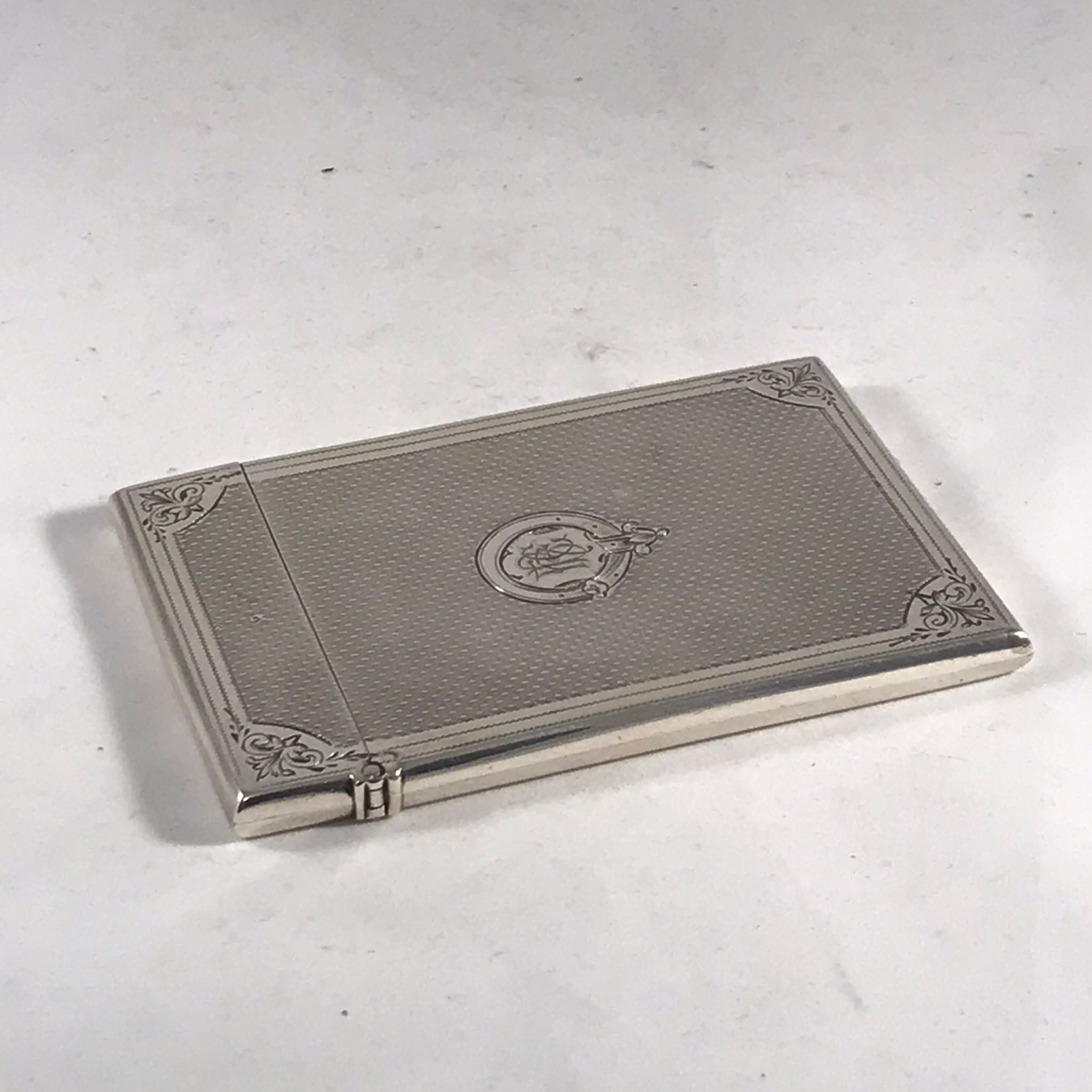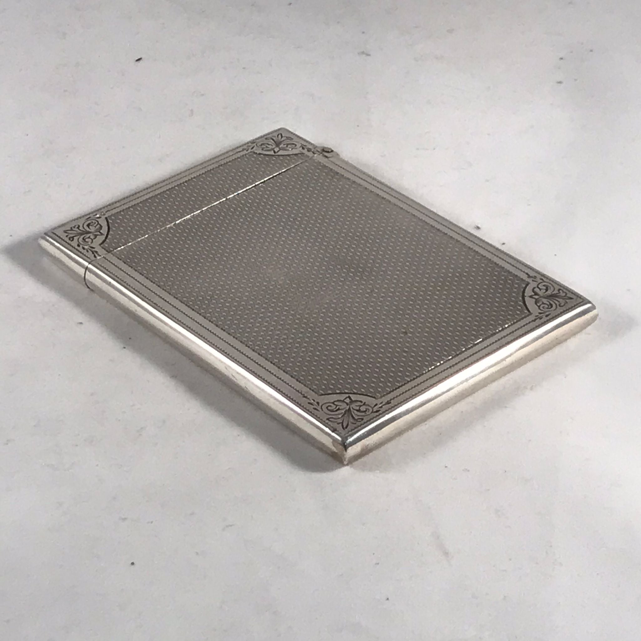 This silver card case is in very good order. There is no rubbing to the decoration and no damage to the case. There are very minor surface marks commensurate with age and minimal use. The hinge is good with no signs of damage or repair. The case closes well with just a very slight gap at the back when the case is closed.