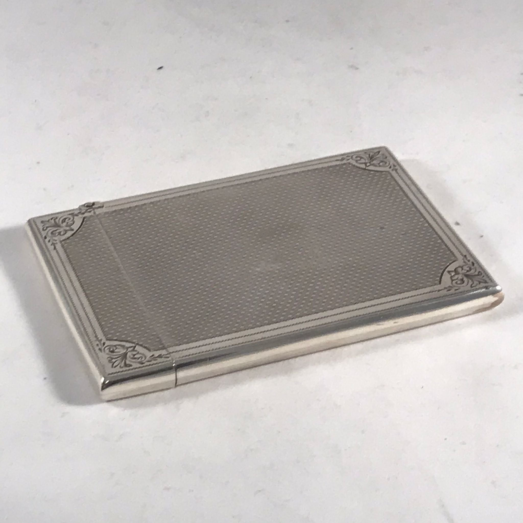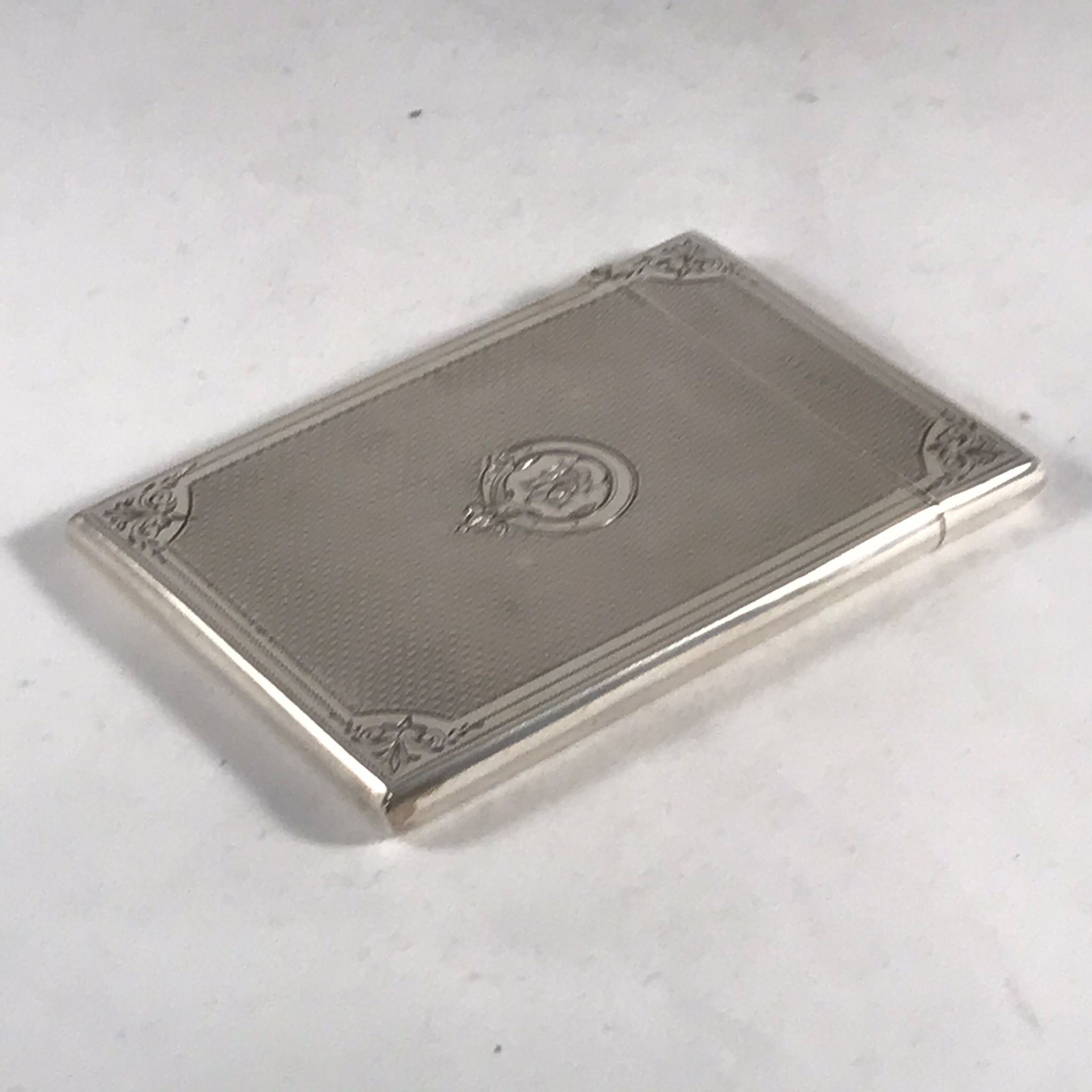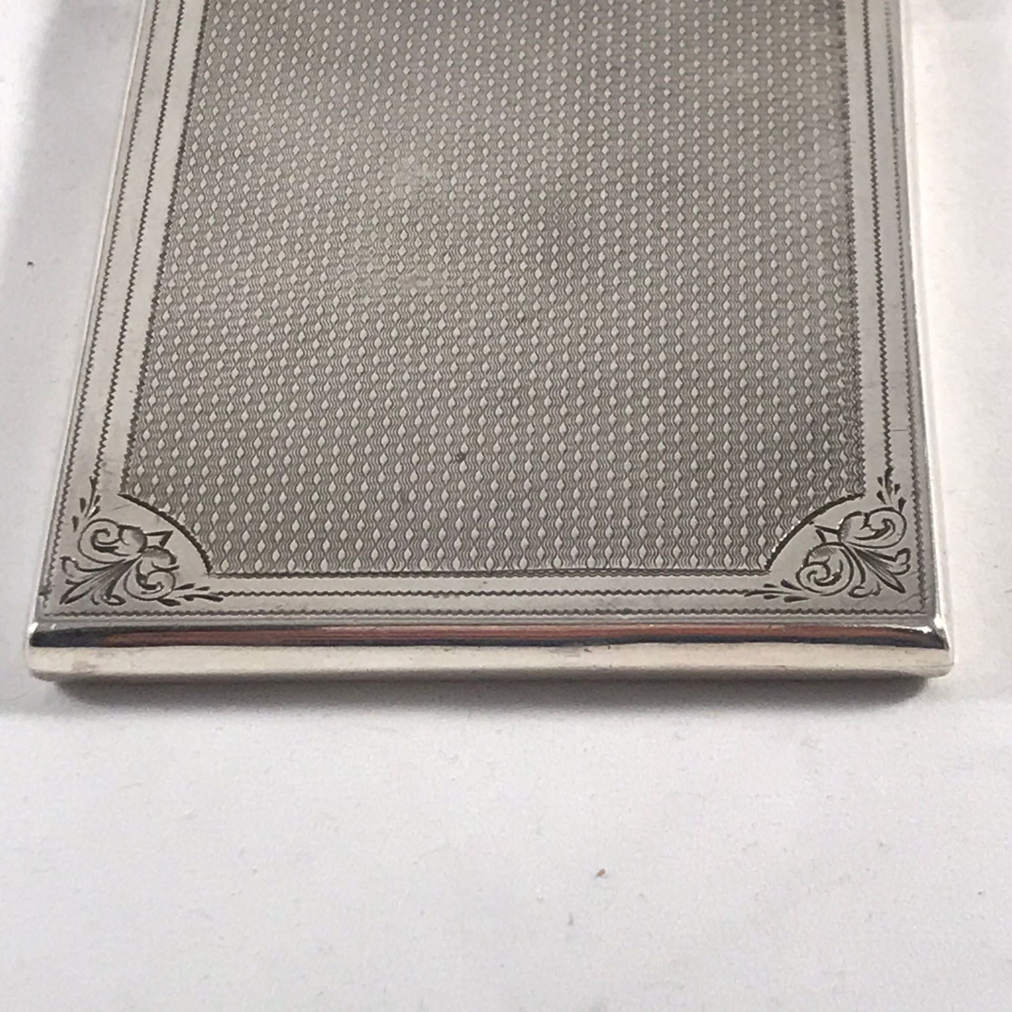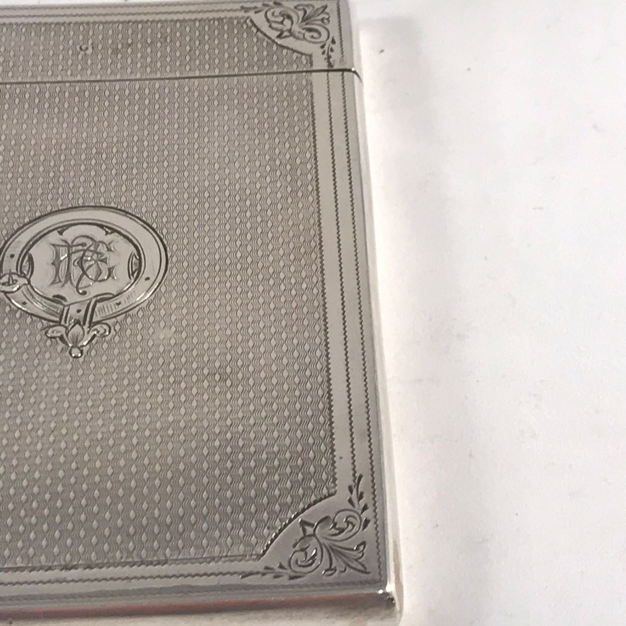 This silver card case is in very good order. There is no rubbing to the decoration and no damage to the case. There are very minor surface marks commensurate with age and minimal use. The hinge is good with no signs of damage or repair. The case closes well with just a very slight gap at the back when the case is closed.