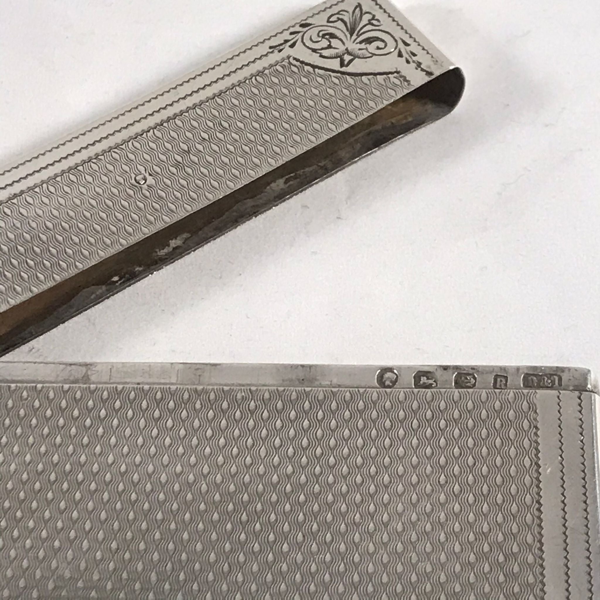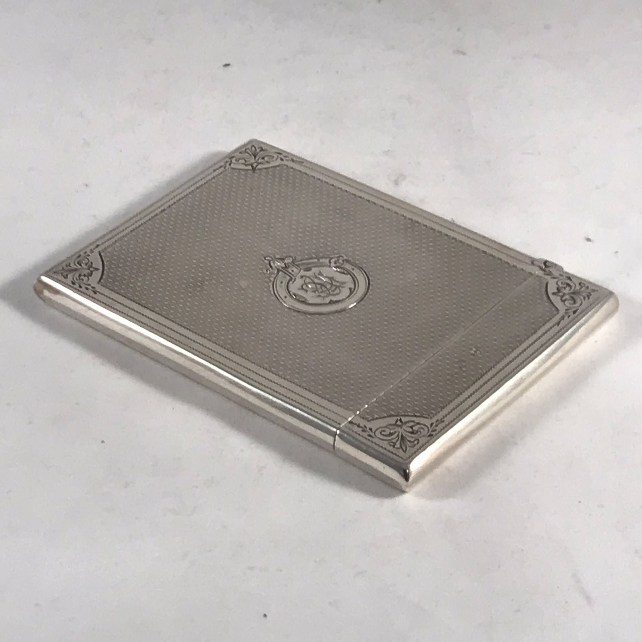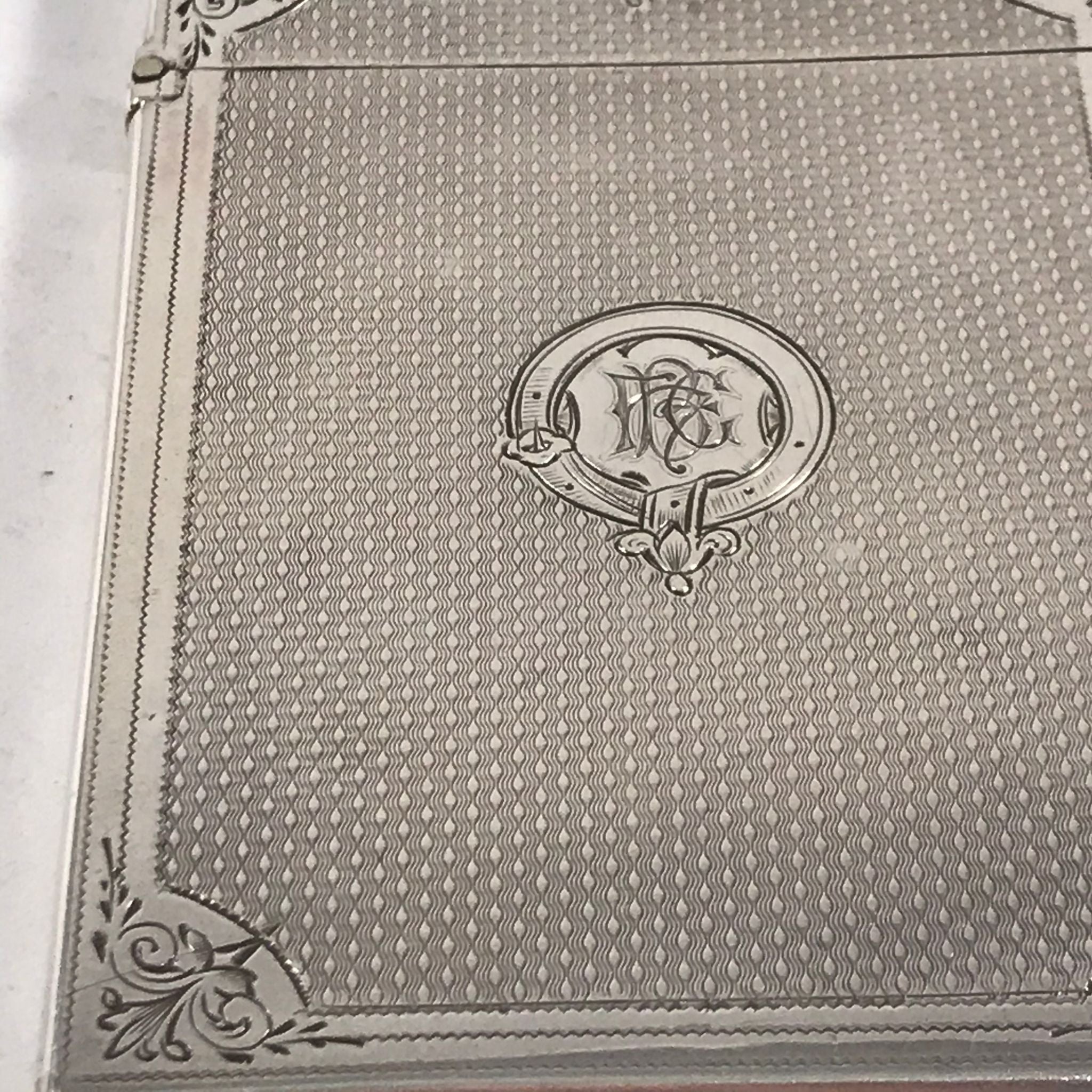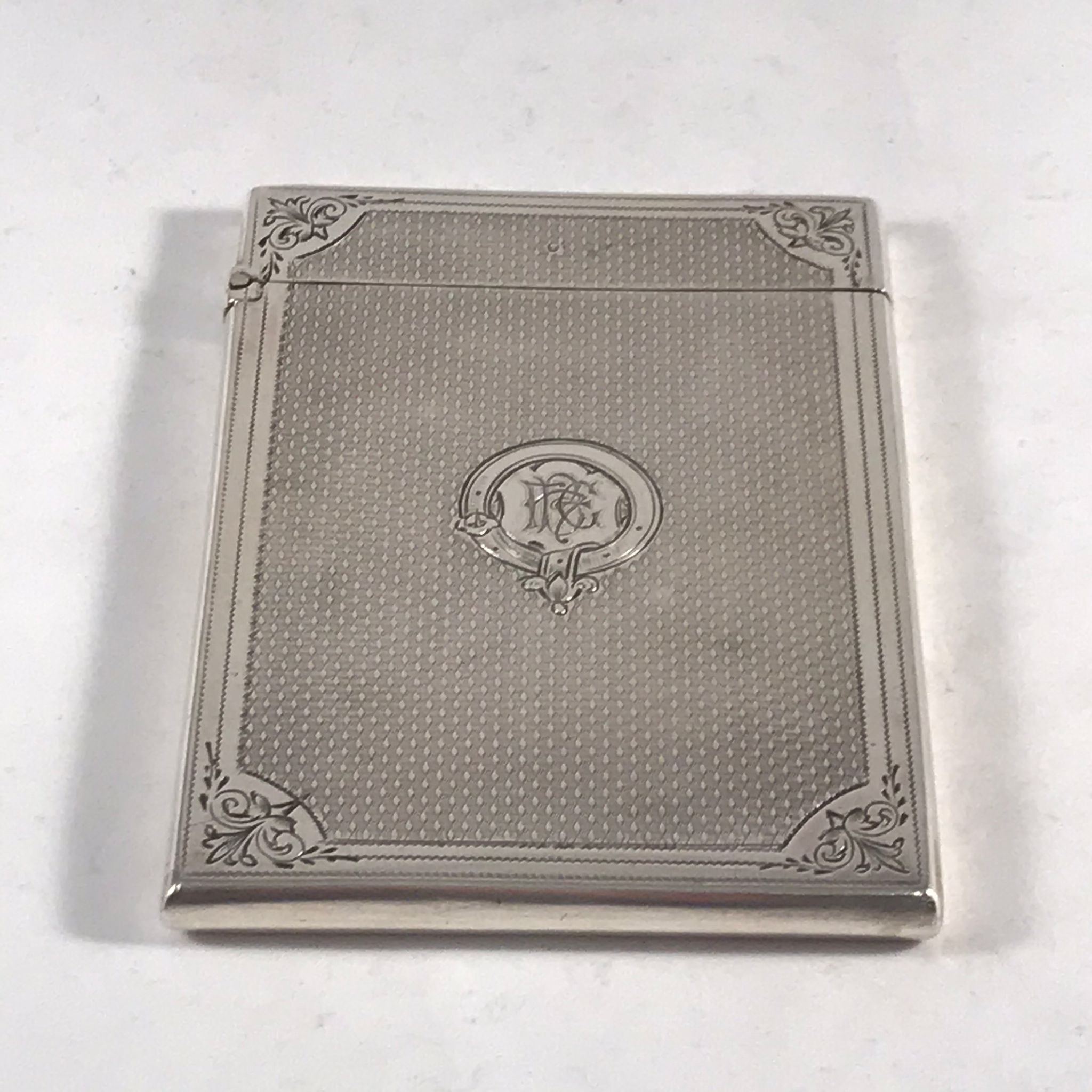 This silver card case is in very good order. There is no rubbing to the decoration and no damage to the case. There are very minor surface marks commensurate with age and minimal use. The hinge is good with no signs of damage or repair. The case closes well with just a very slight gap at the back when the case is closed.