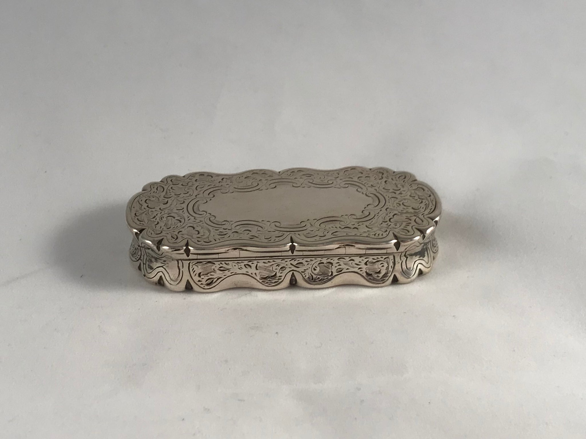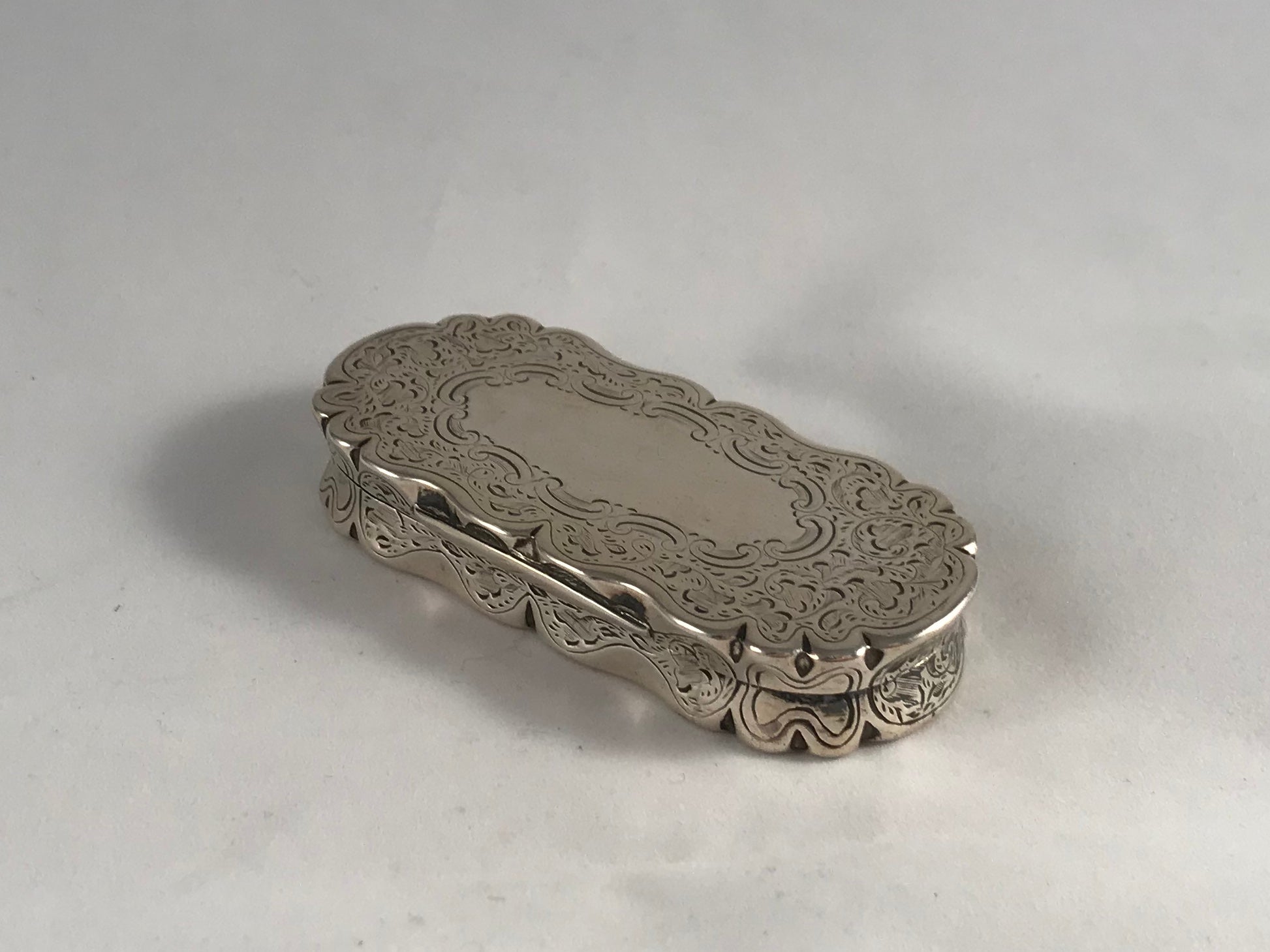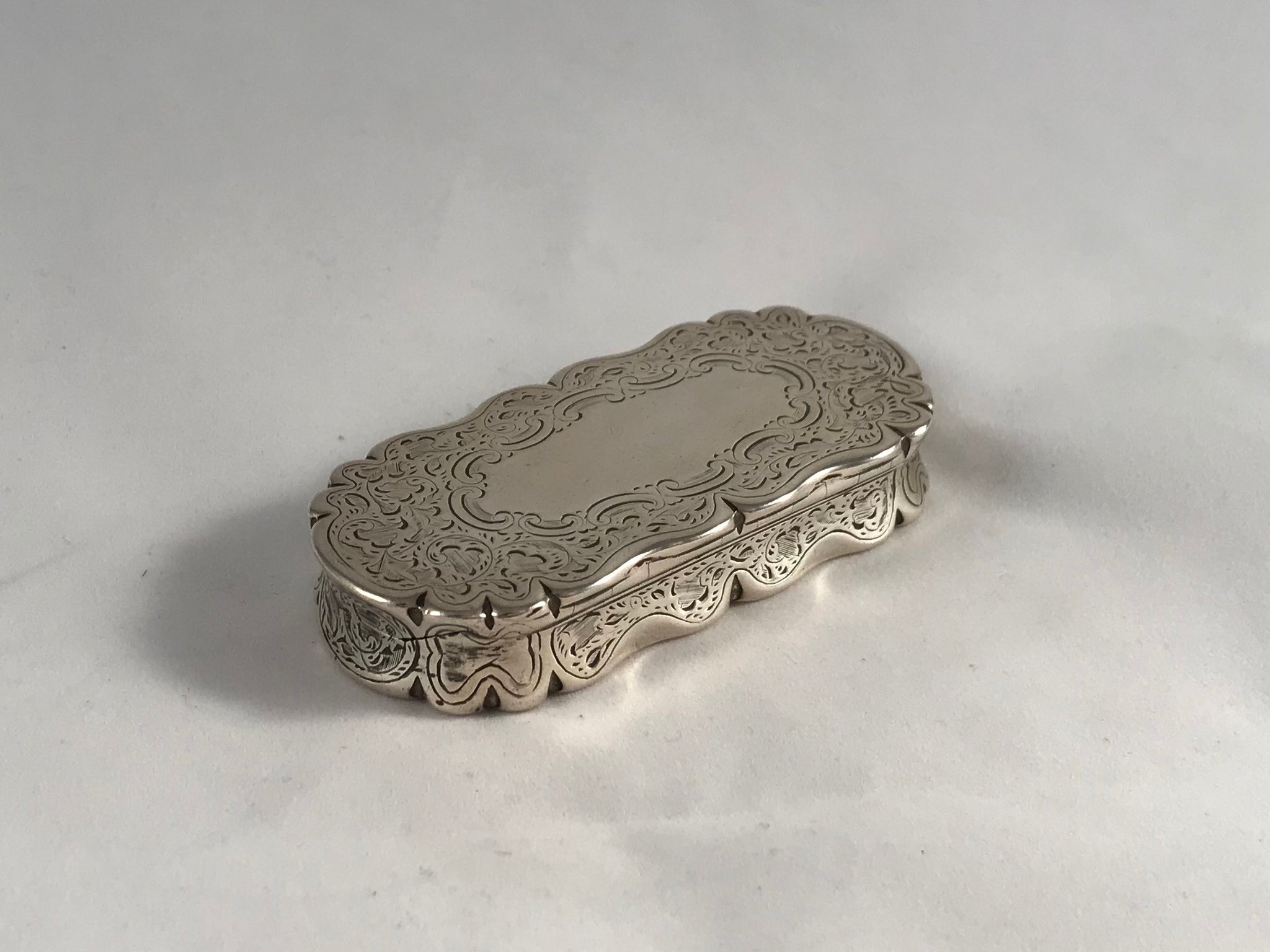An exceptional quality hallmarked silver snuff box by Frederick Marson.  This Victorian silver snuff box is an unusual and beautiful shape and has an engraved decoration with a central motif on the top and unusually this decoration is continuing on the base.  By a well established and one of the most renowned silversmiths for boxes and cases of the period, this is a really beautiful example of a Victorian silver snuff box to add to a collection or start a new one.