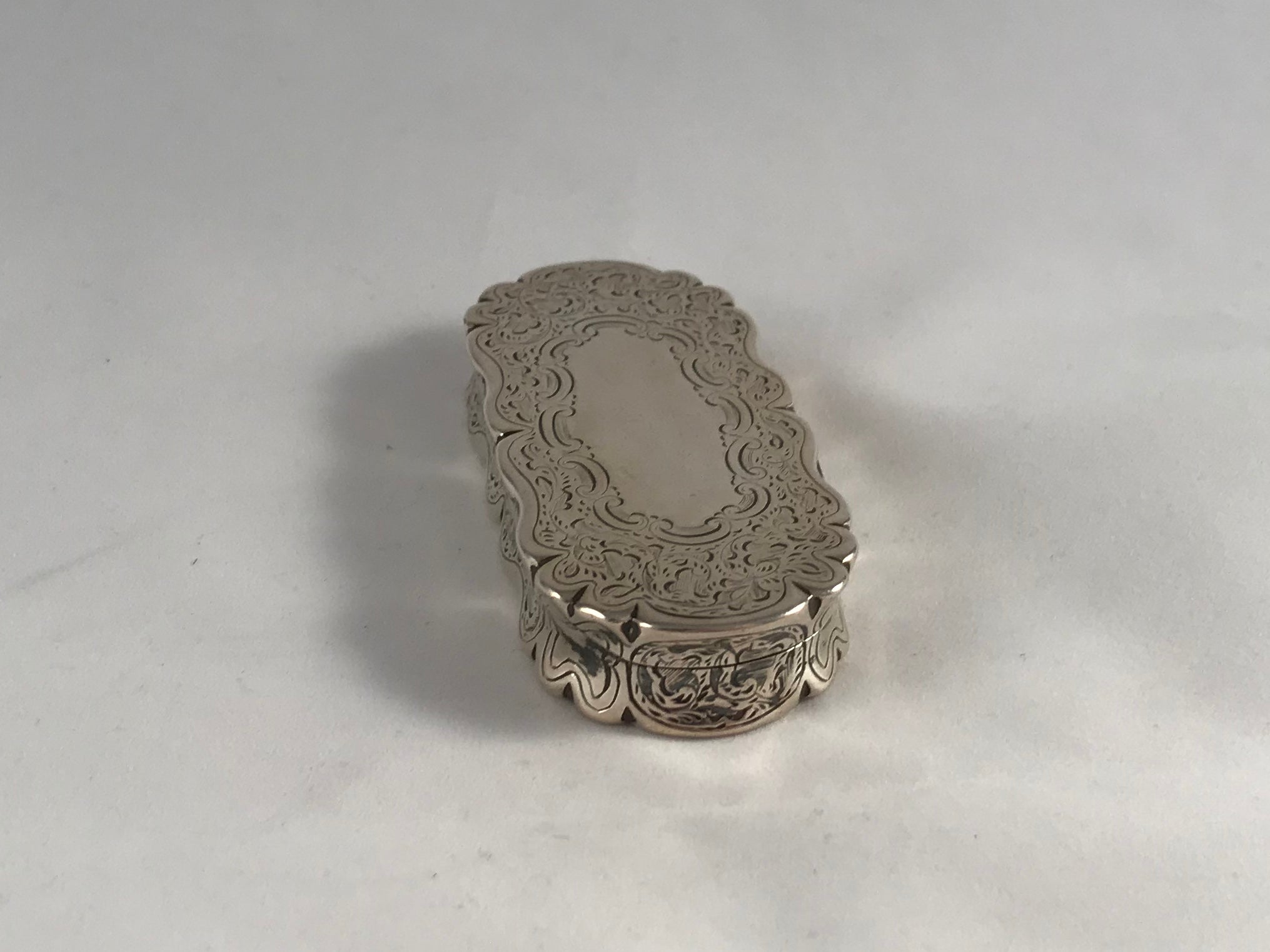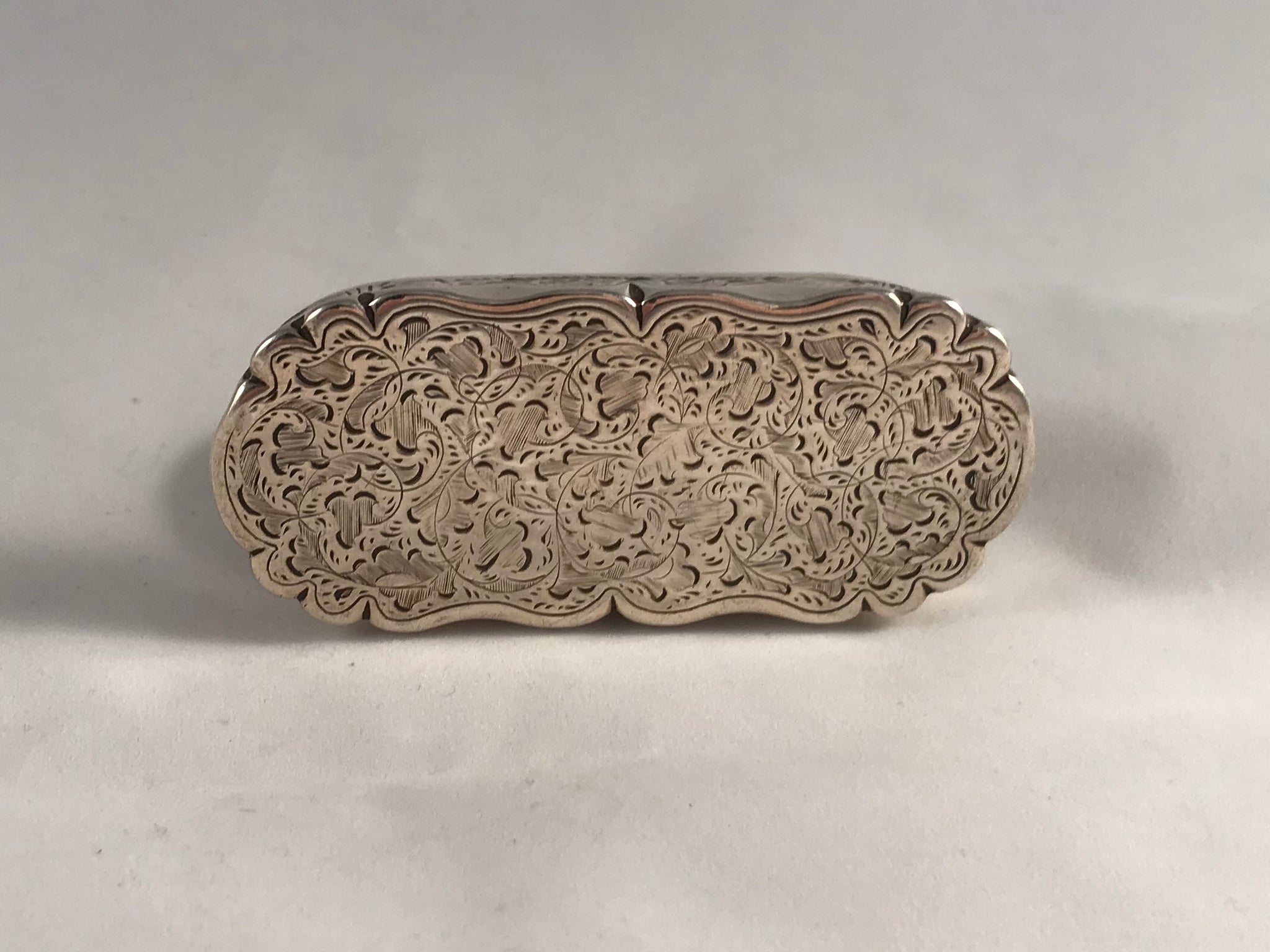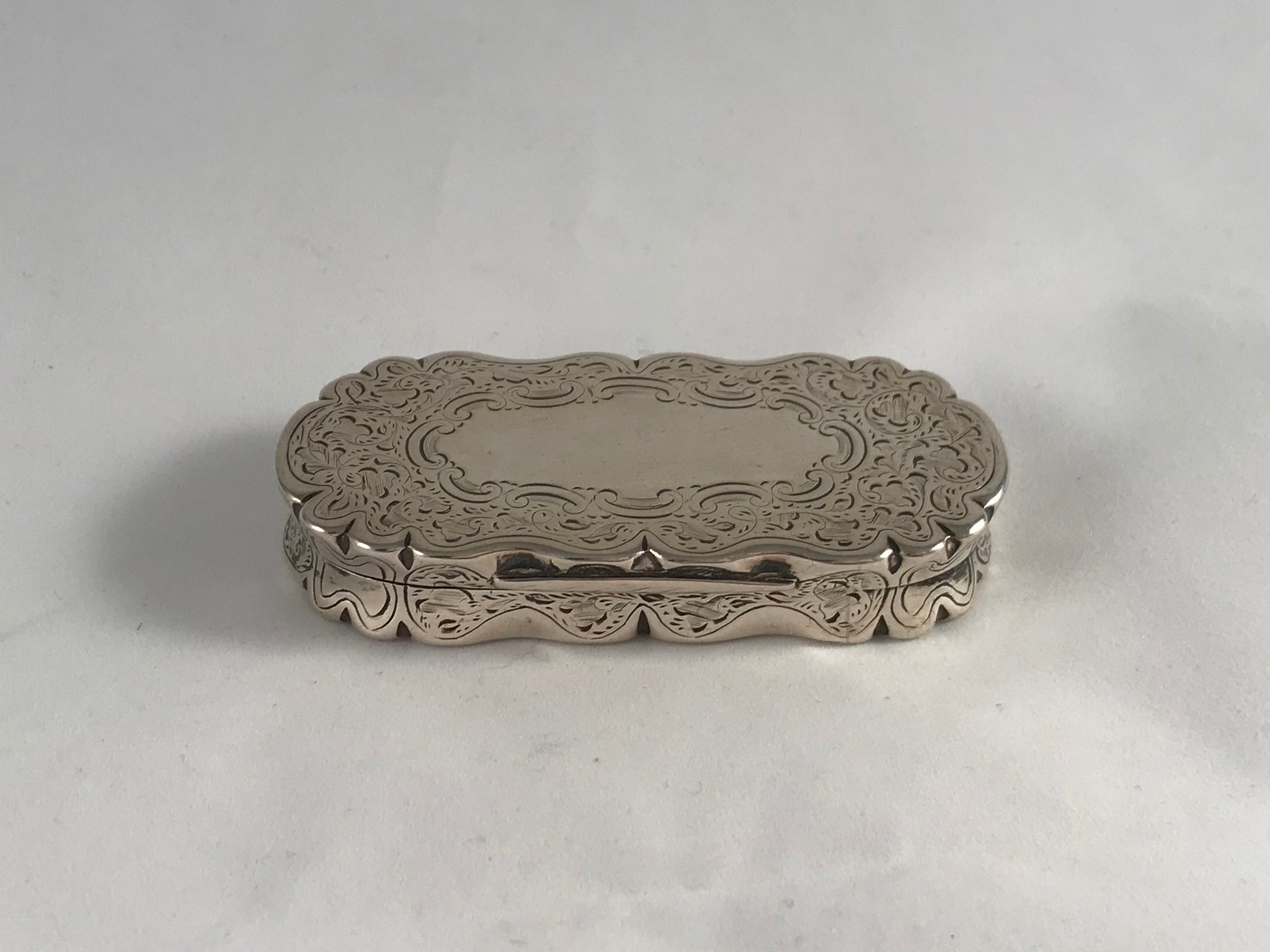 An exceptional quality hallmarked silver snuff box by Frederick Marson.  This Victorian silver snuff box is an unusual and beautiful shape and has an engraved decoration with a central motif on the top and unusually this decoration is continuing on the base.  By a well established and one of the most renowned silversmiths for boxes and cases of the period, this is a really beautiful example of a Victorian silver snuff box to add to a collection or start a new one.