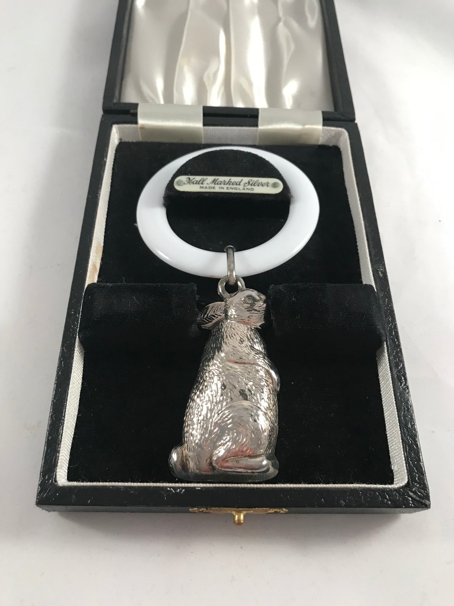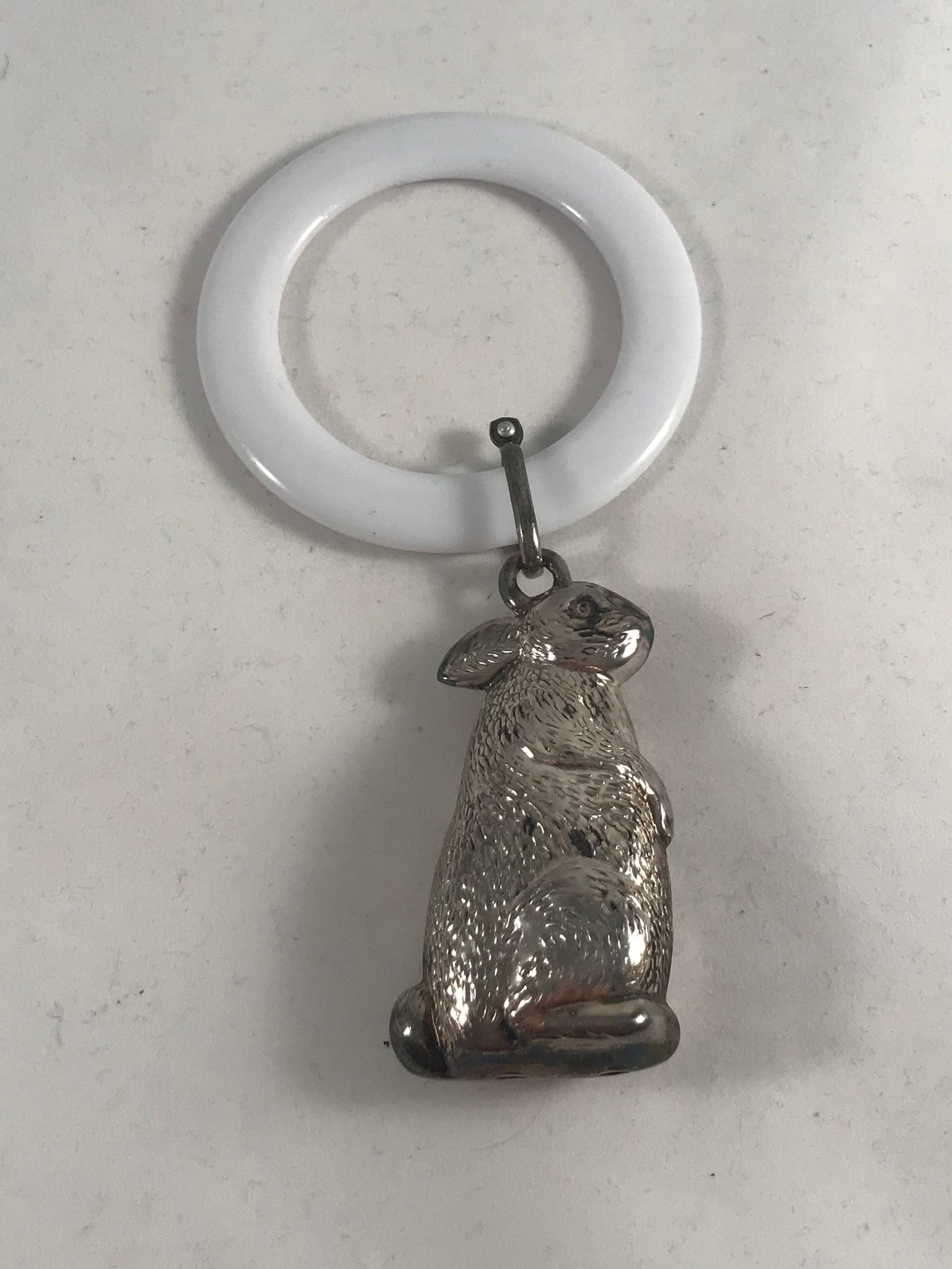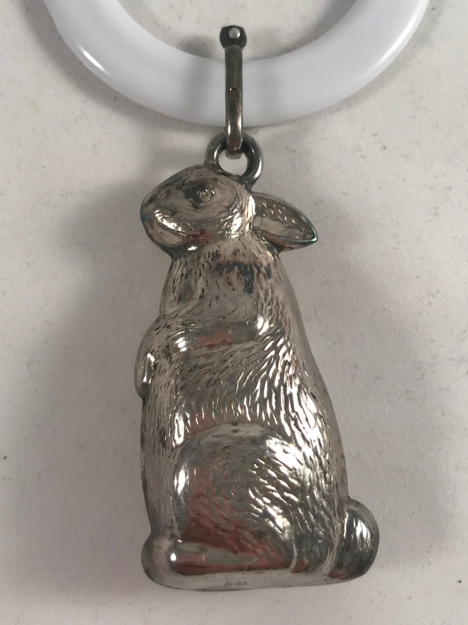 A lovely modern Baby’s teething ring and rattle. Fully hallmarked with good clear marks. this is a well modelled and attractive model.  A lovely christening gift or a lovely item of collectable silver.