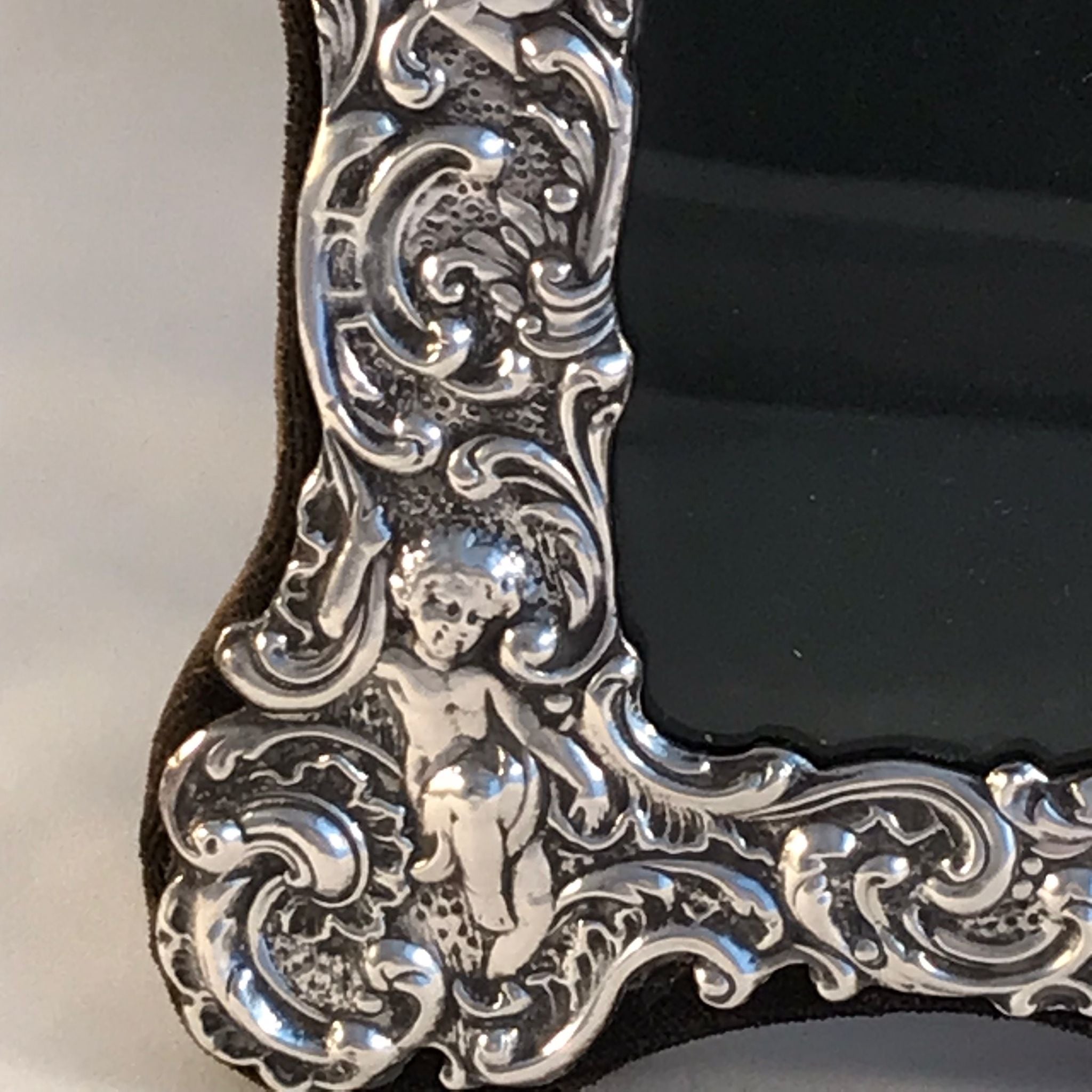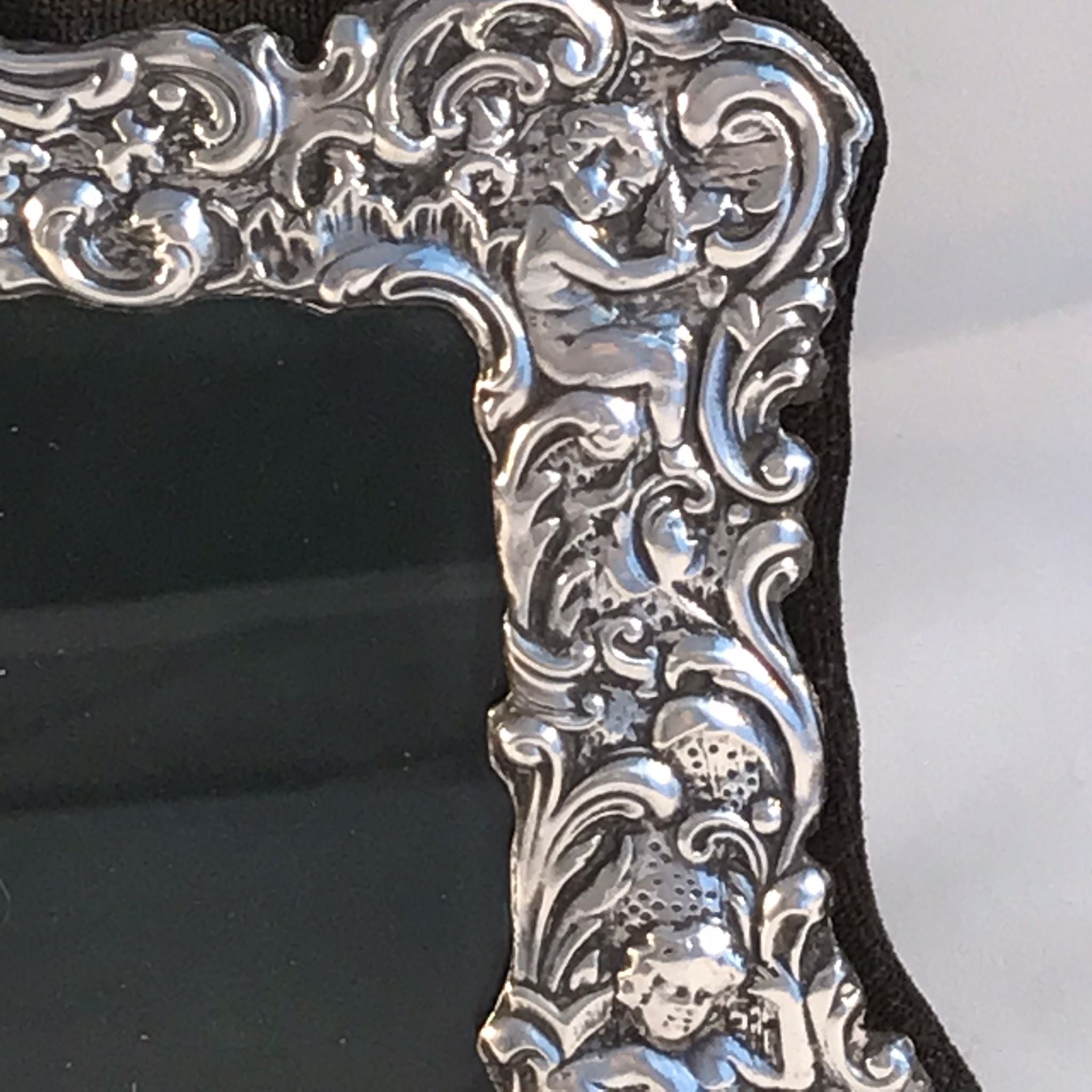 A very ornate and heavily embossed silver photograph frame. This picture frame is a lovely size and shape with intricate detail including cherubs, foliage and a blank cartouche to the top. It is only suitable for displaying pictures horizontally. Perfect for displaying treasured memories or pictures of loved ones. This frame would also make a great silver gift for a special occasion including wedding presents, special birthdays or a christening gift. Why not make it even more unique by adding a special picture before sending it as a gift.