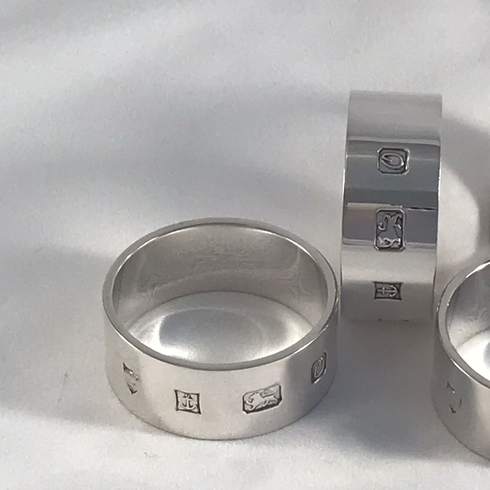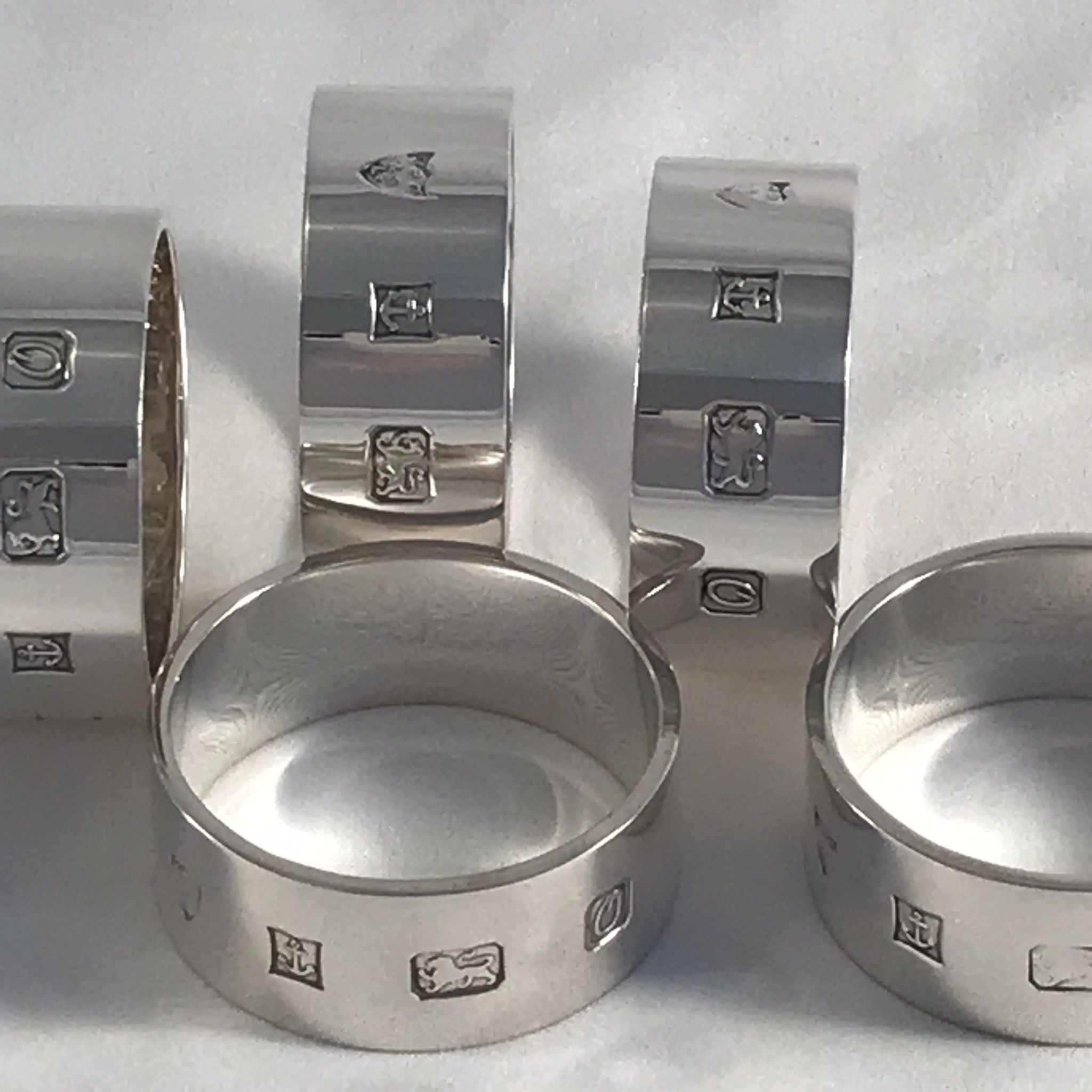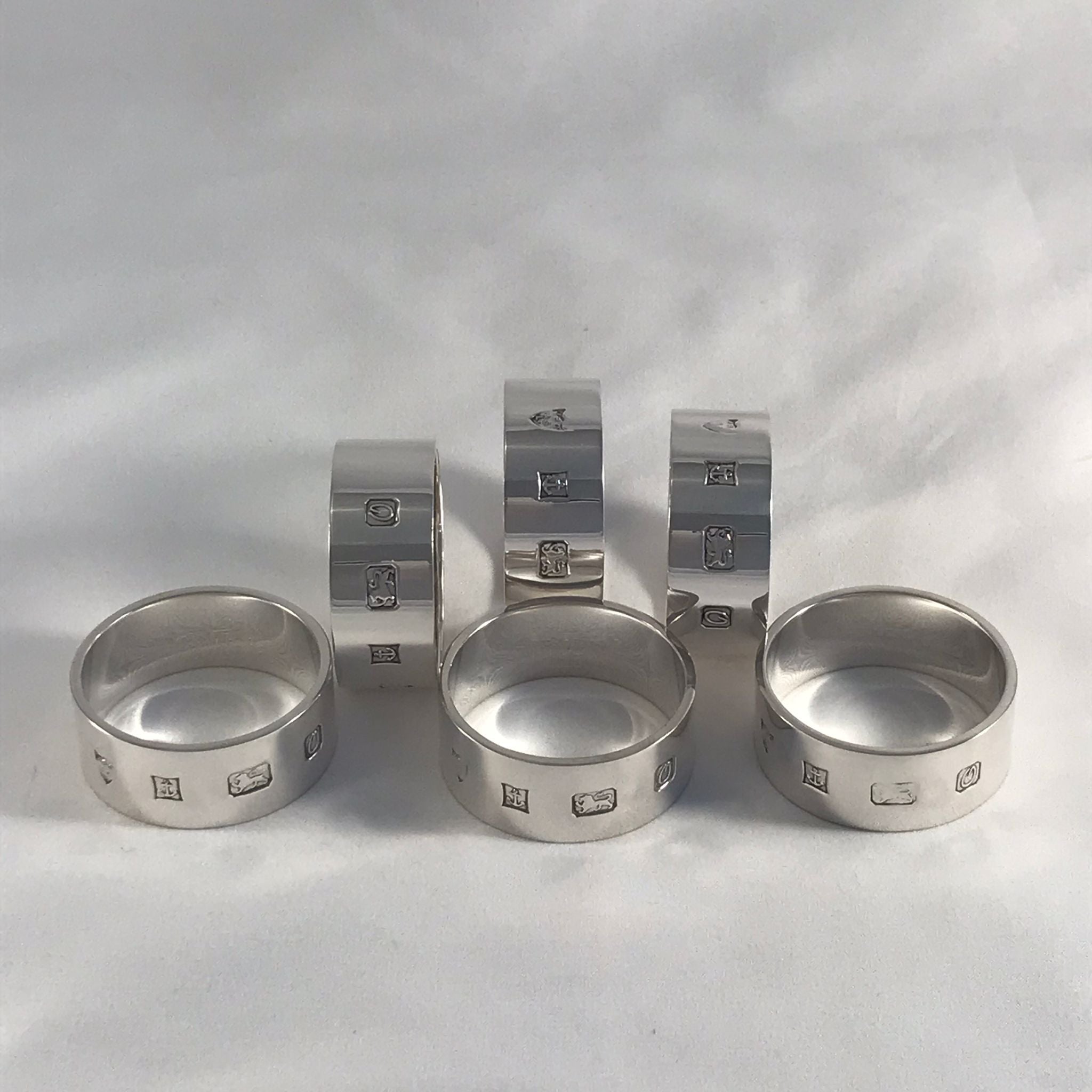 A set of six really high quality silver Napkin Rings with feature hallmarks. These are a heavy set and make a real statement.