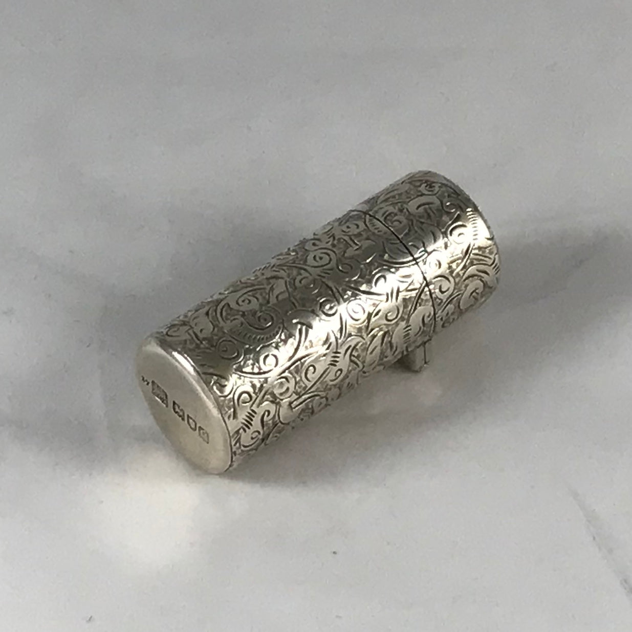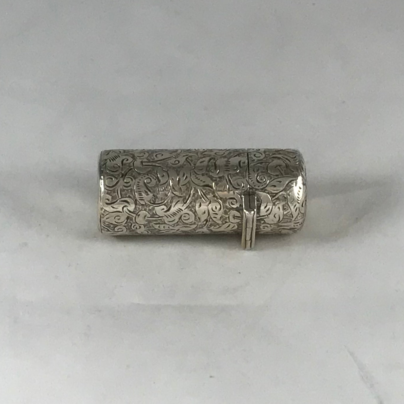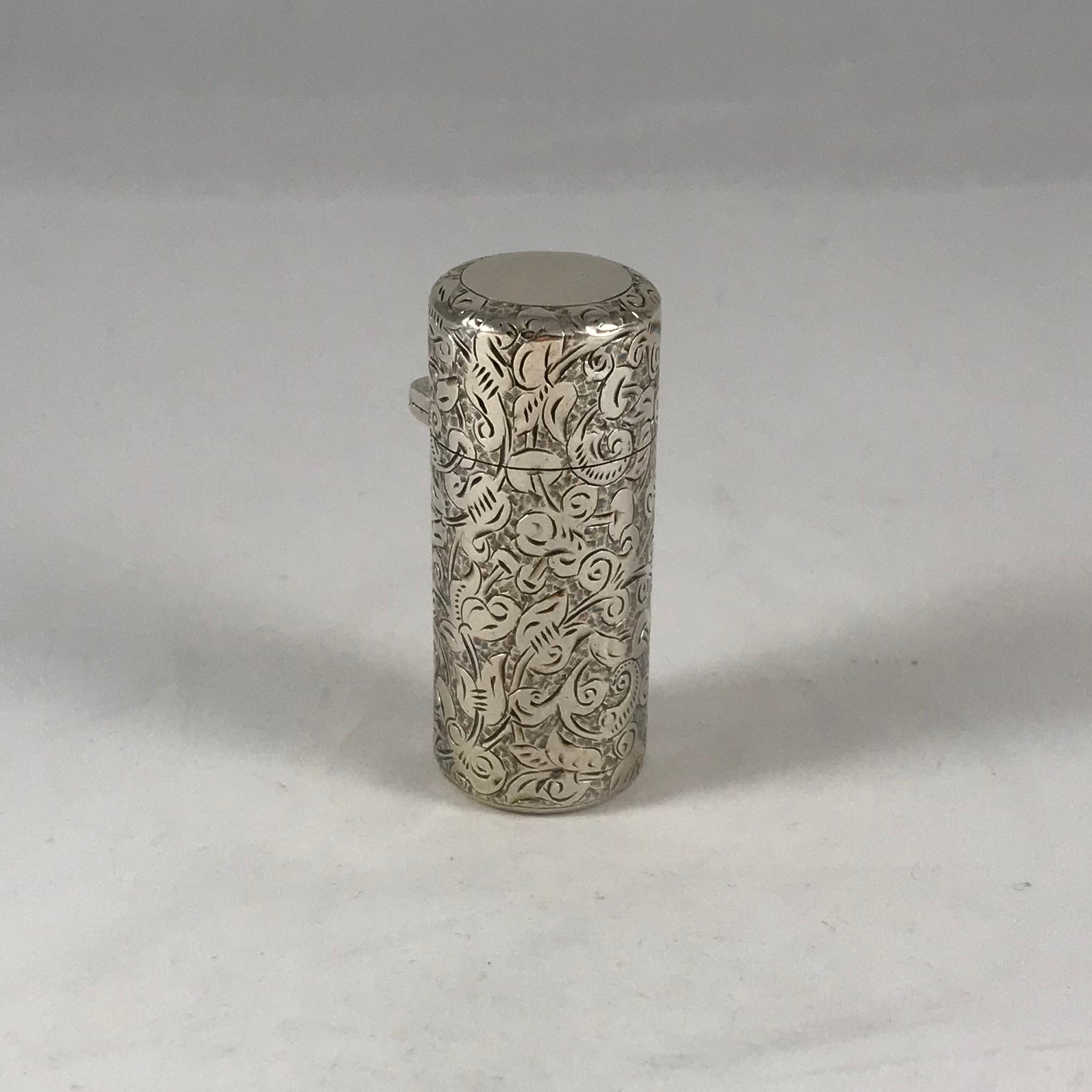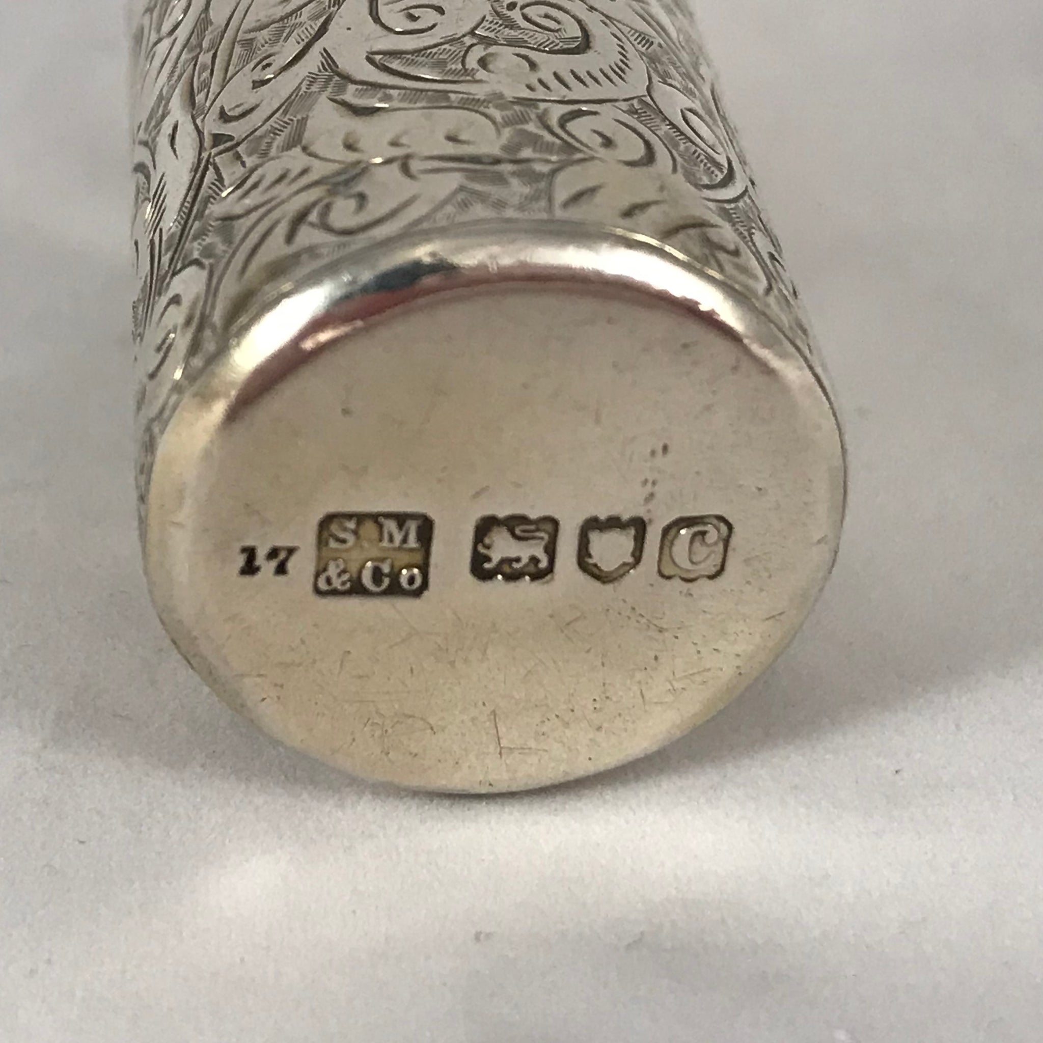 A really striking silver scent bottle by Sampson Mordan. This is a beautiful piece of collectable silver by a renowned and prestigious silversmith. The detail in the engraving on this silver scent bottle is incredibly detailed. There is an unengraved circular cartouche on the lid. A lovely Victorian silver scent bottle in great condition by Sampson Mordan, a lovely item of collectable silver.