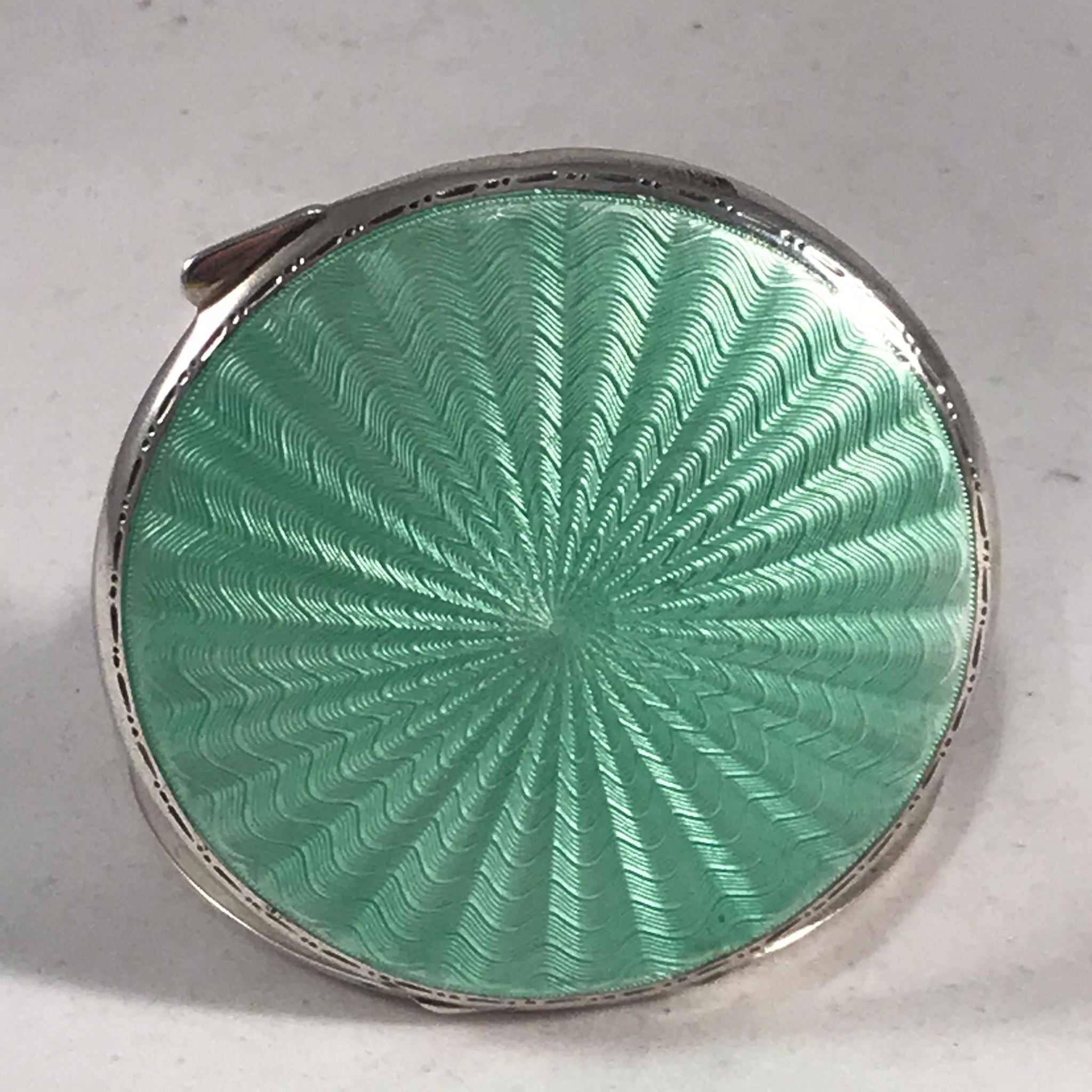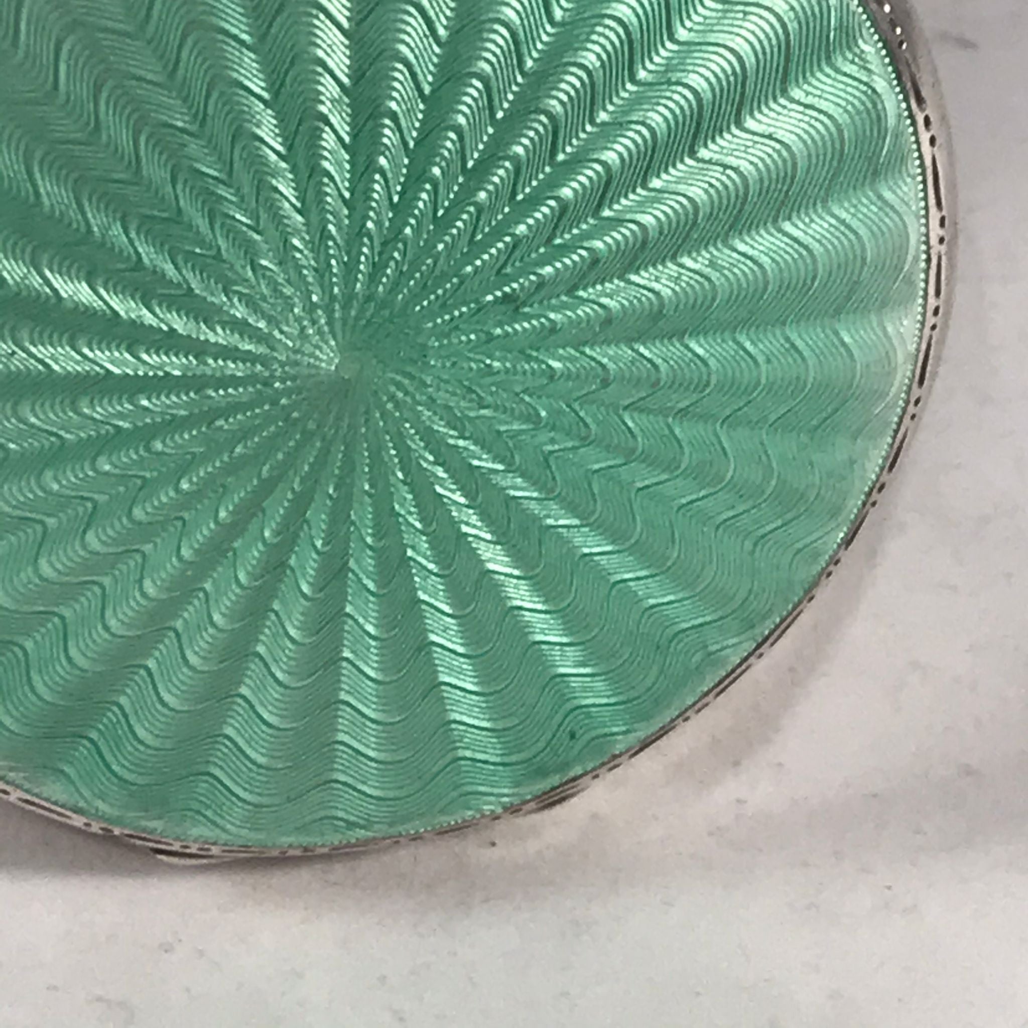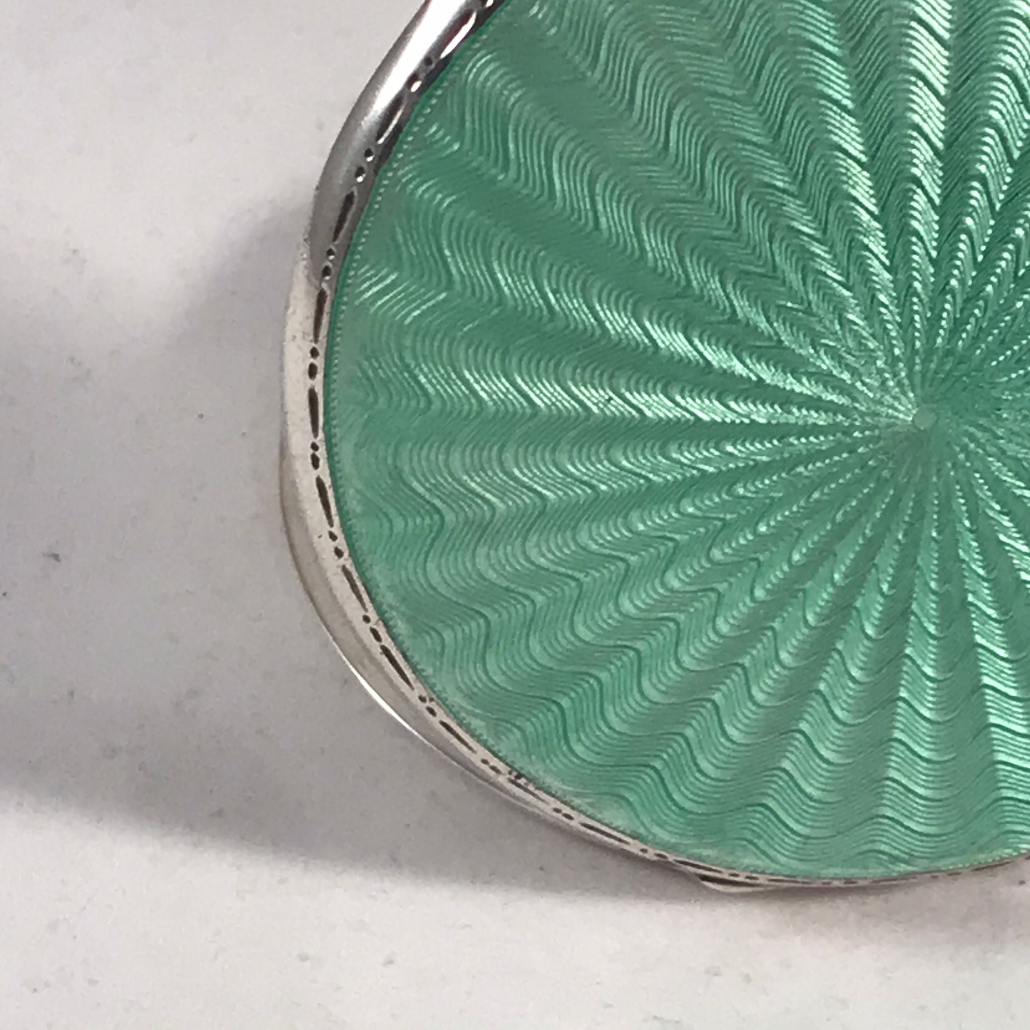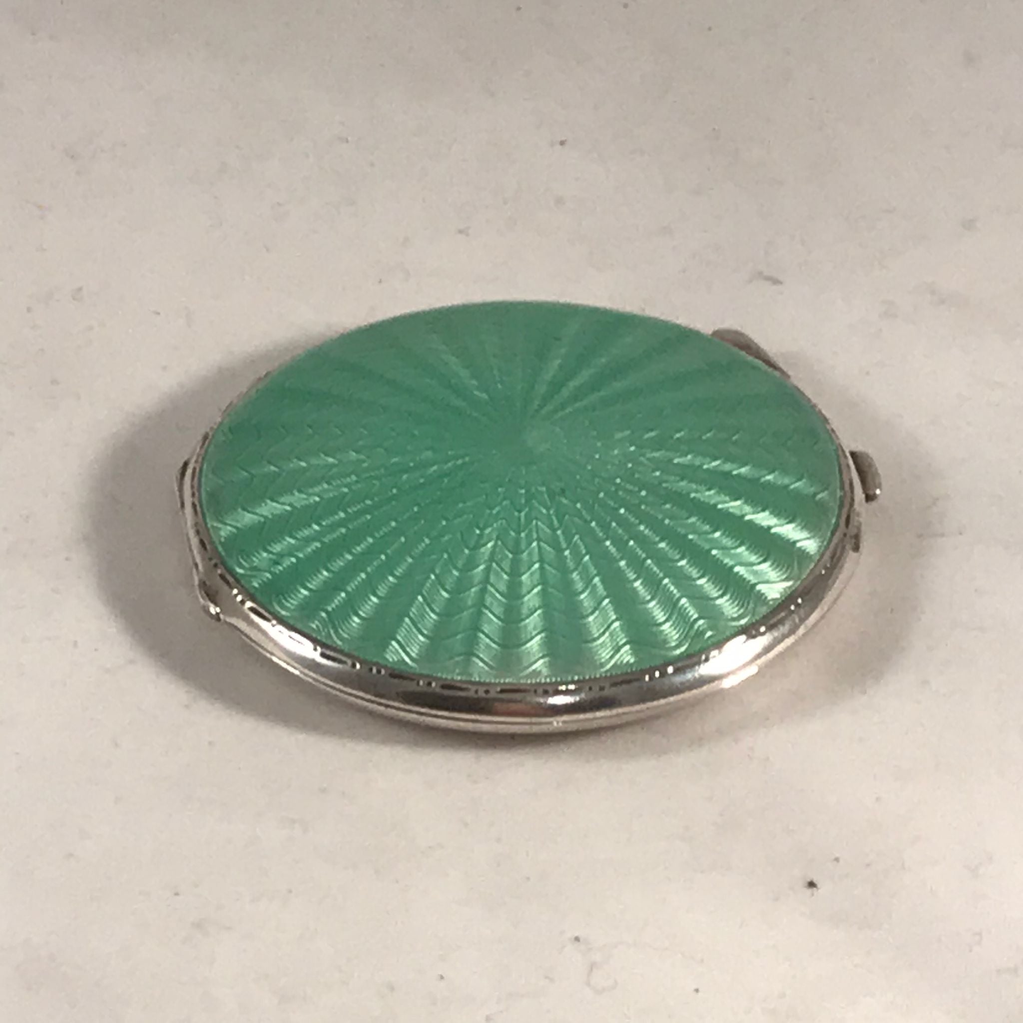 A really striking green silver and enamel compact. The top of this compact is enamel and is a beautiful green colour, the base is silver and has a quality engine turned design. This has some of the inserts but is not complete - see pictures. A highly collectable silver and enamel compact.