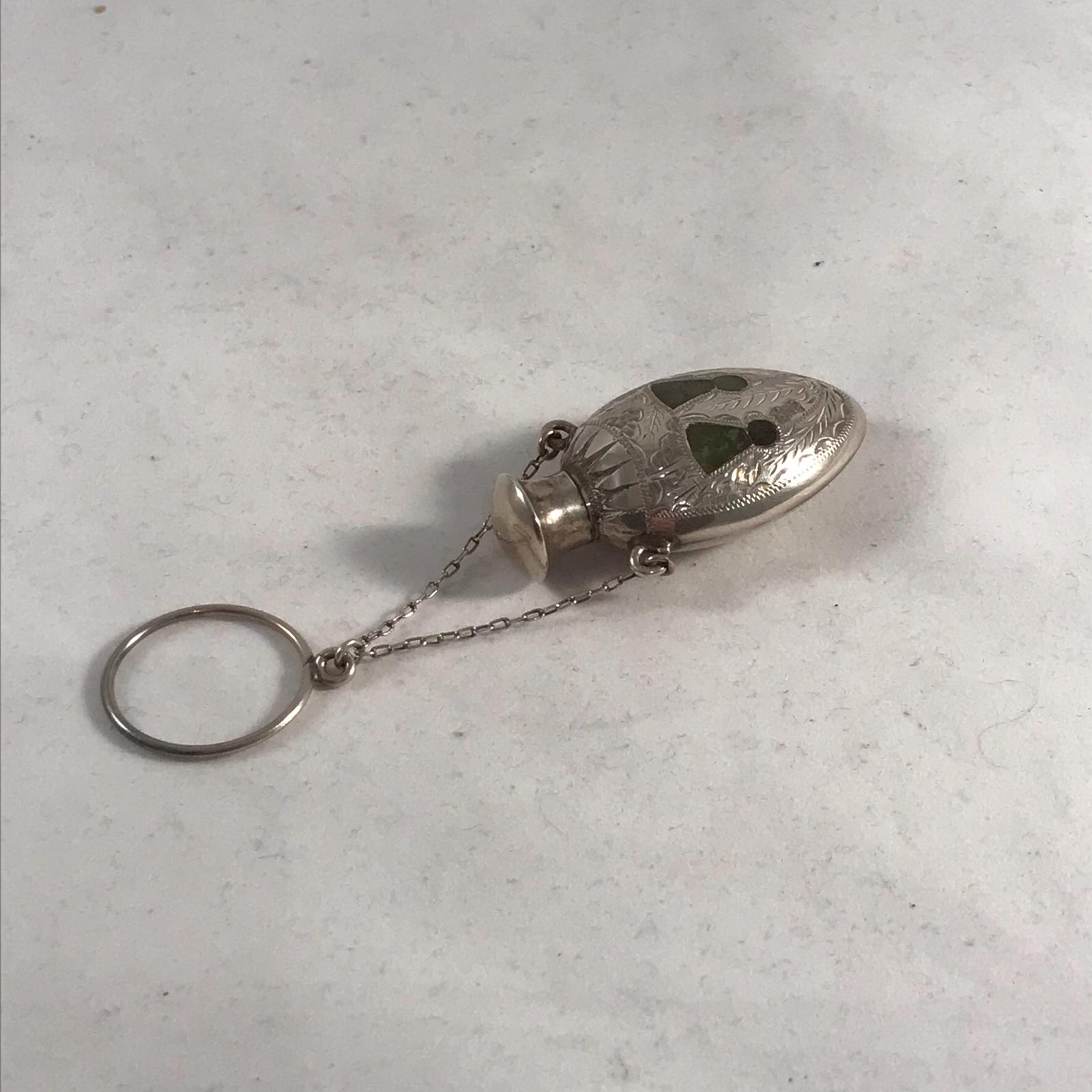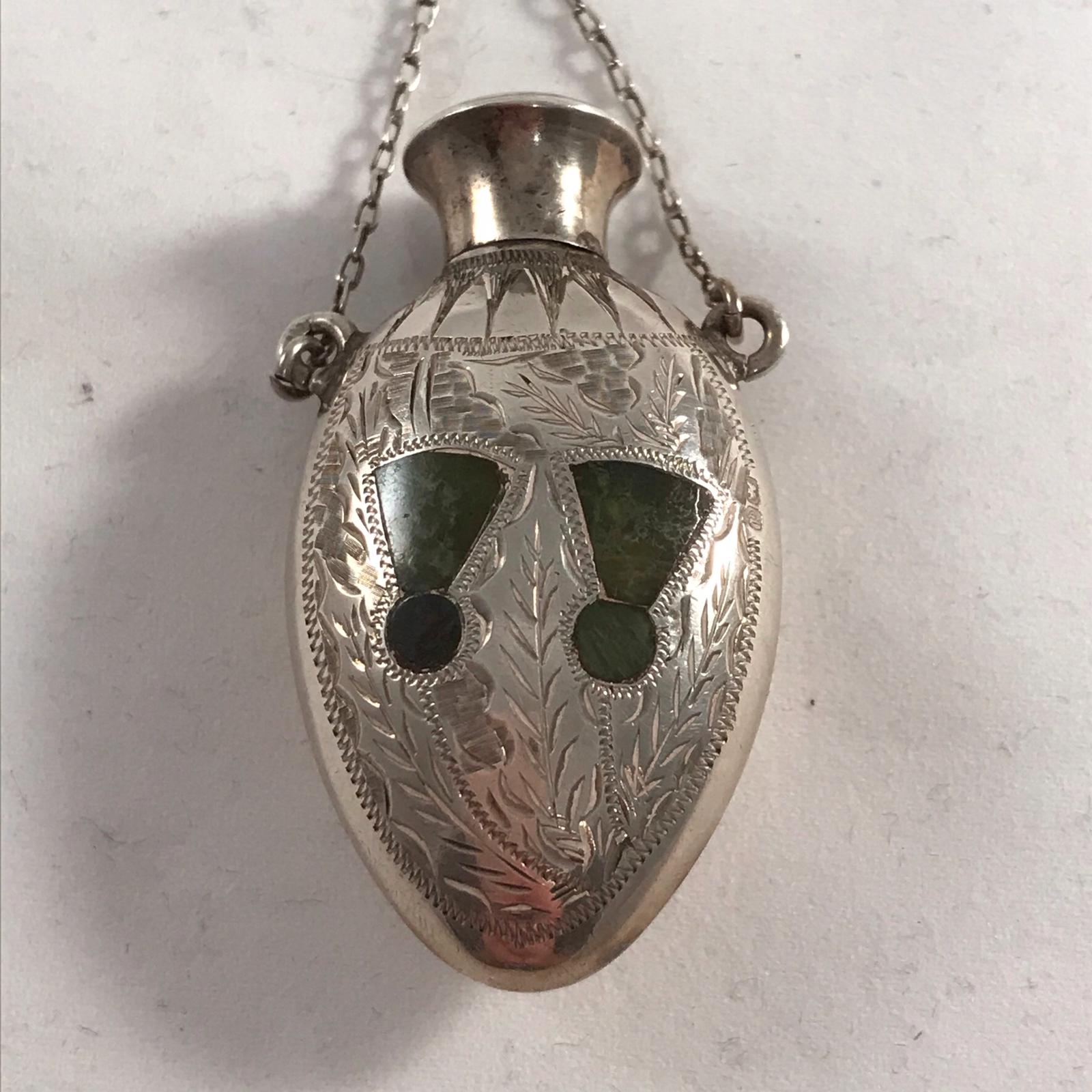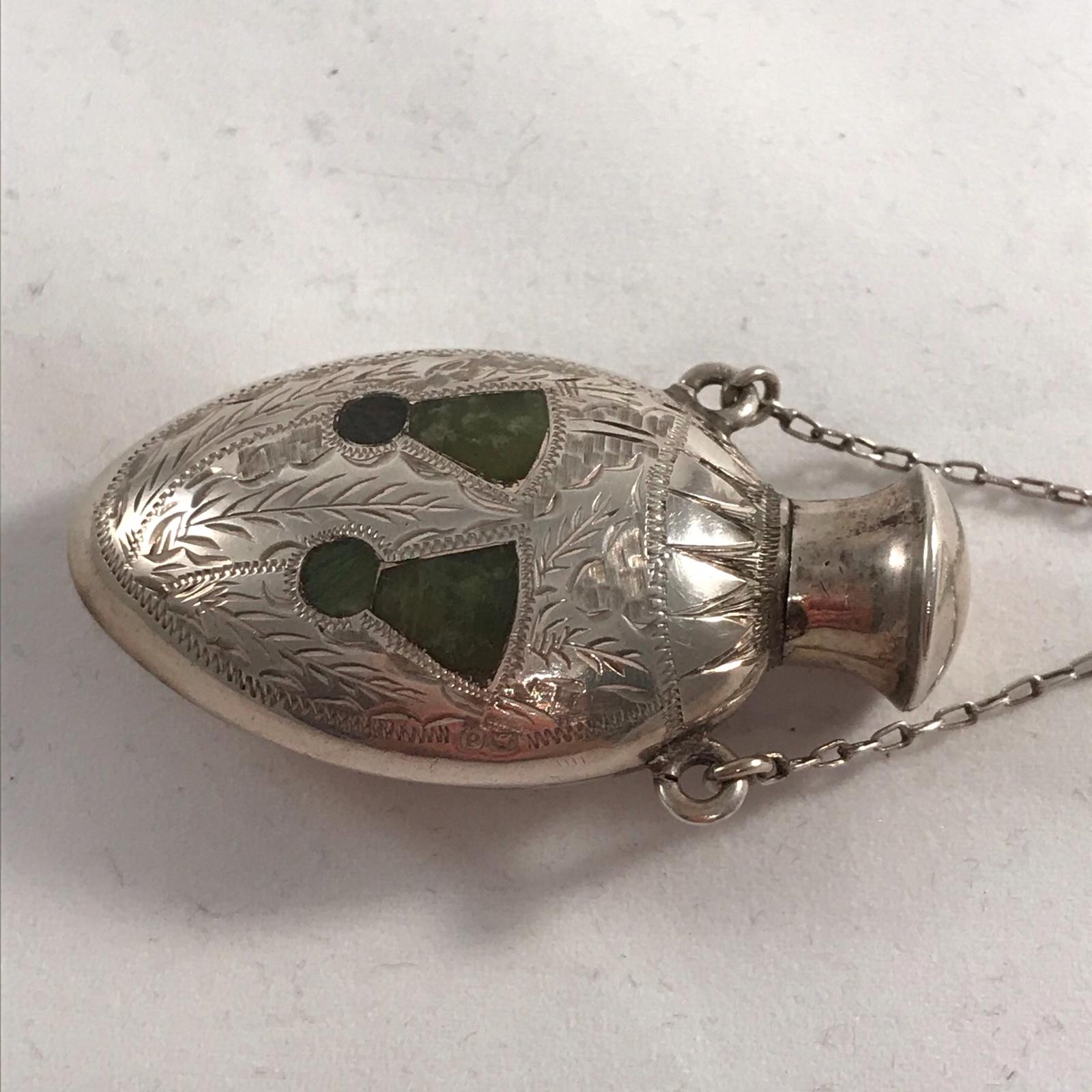 A superb quality Edwardian silver agate and silver miniature scent bottle. This has a chain and ring attached and was designed to be worn attached to a chatelaine. It has an engraved decoration to the front which is inset with two green agate thistles. The back is plain and this is where it is hallmarked. The top unscrews on a thread. A really high quality and lovely piece of collectable antique silver.