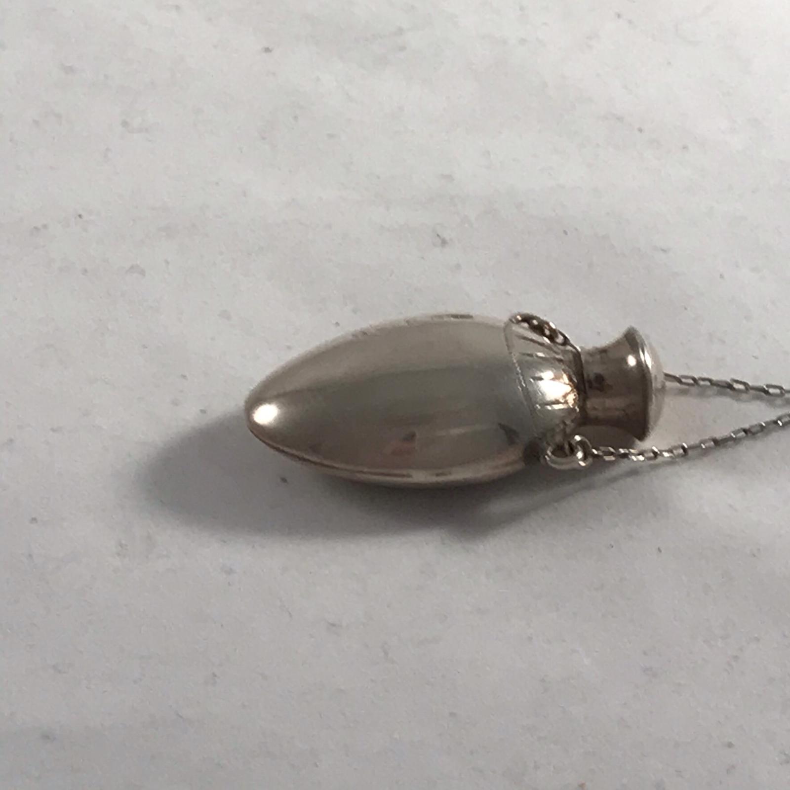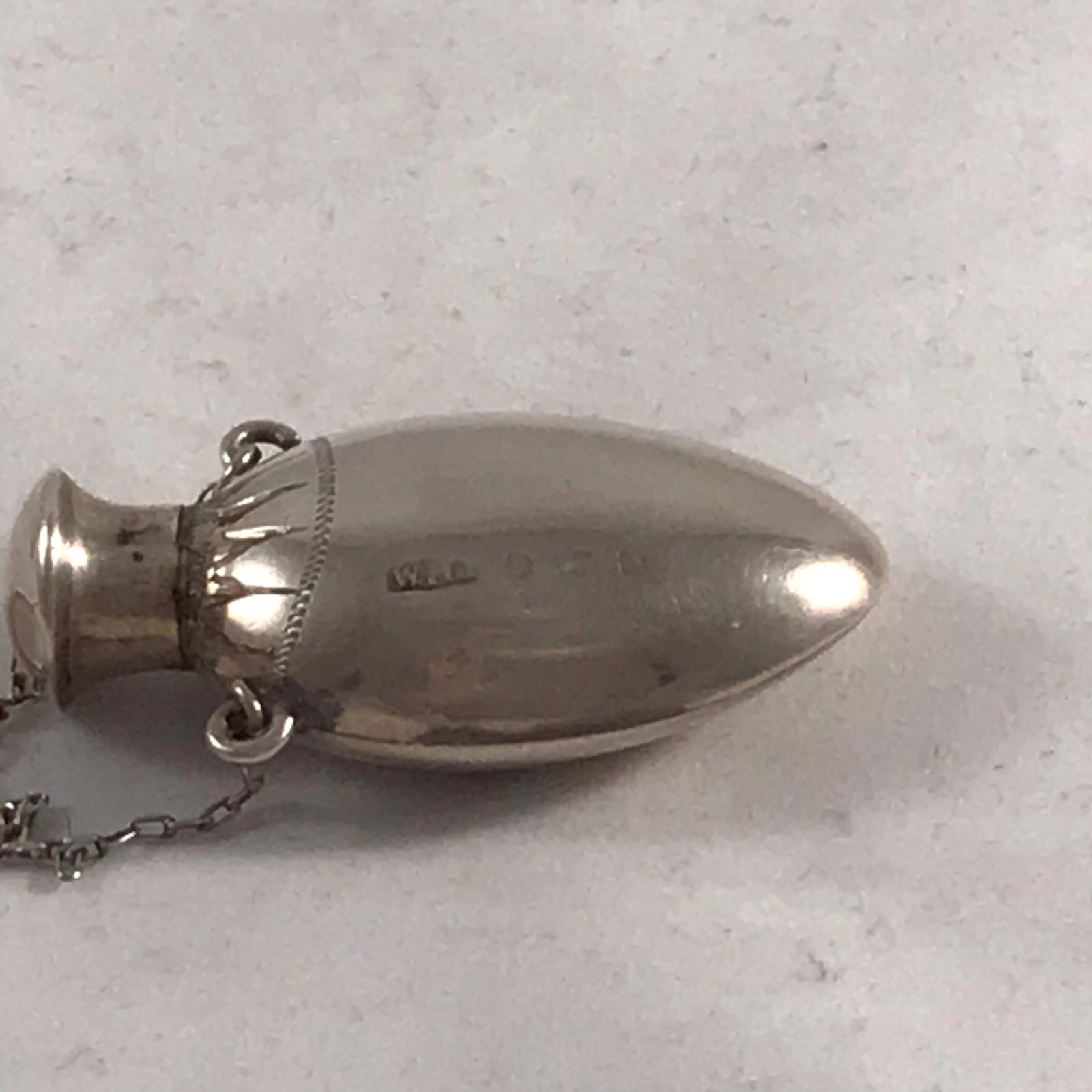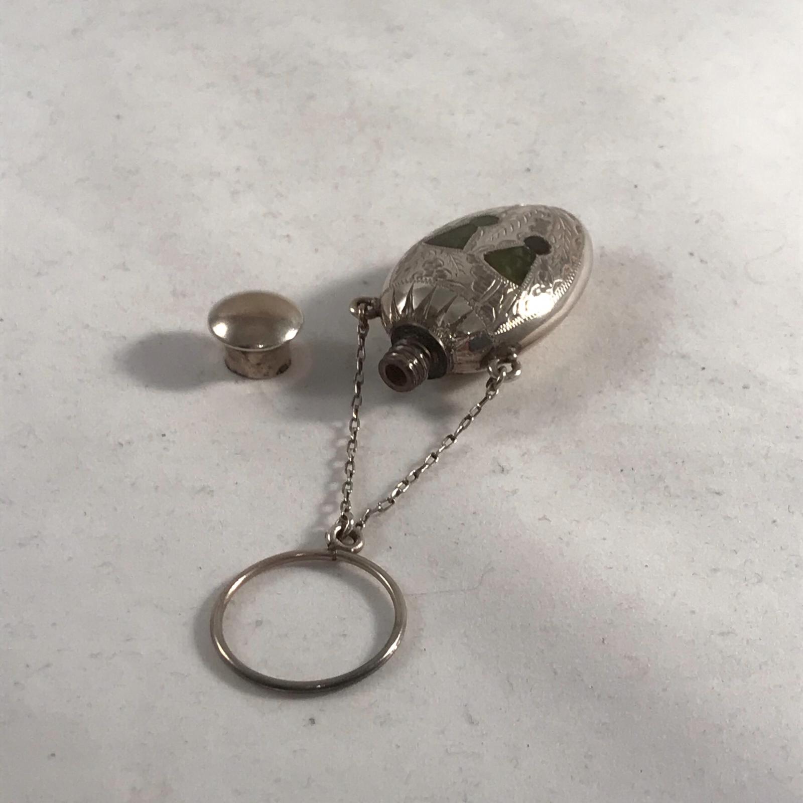 A superb quality Edwardian silver agate and silver miniature scent bottle. This has a chain and ring attached and was designed to be worn attached to a chatelaine. It has an engraved decoration to the front which is inset with two green agate thistles. The back is plain and this is where it is hallmarked. The top unscrews on a thread. A really high quality and lovely piece of collectable antique silver.