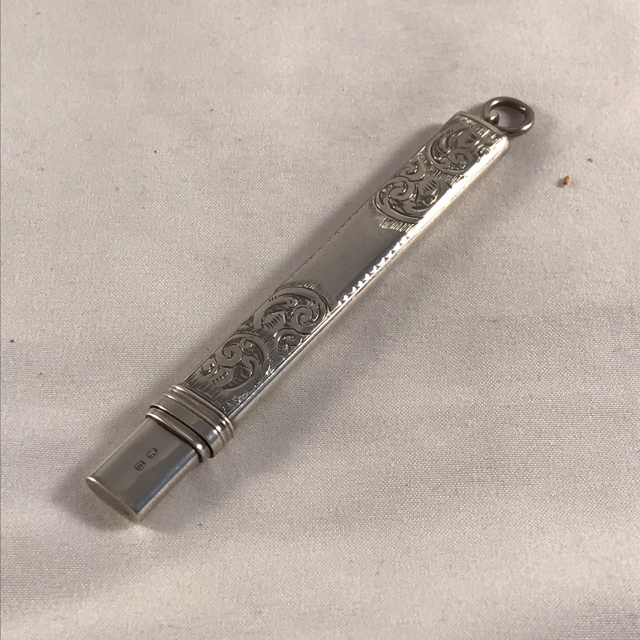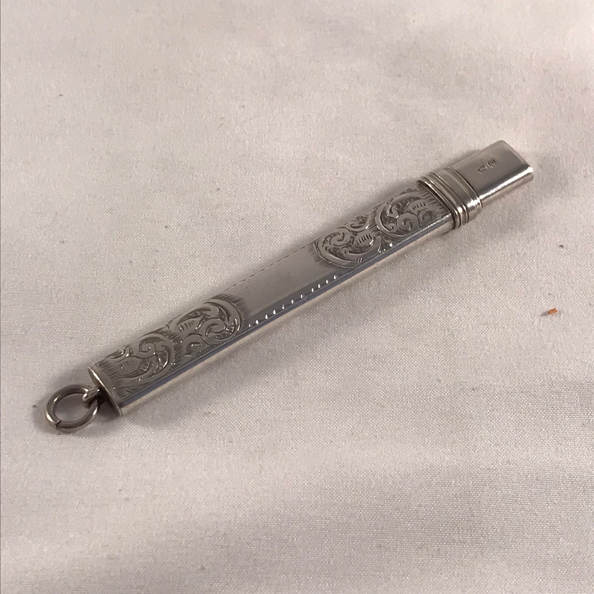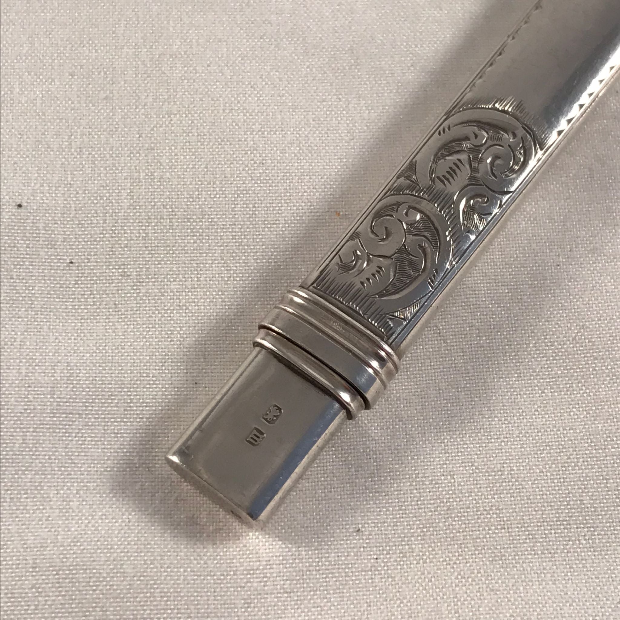 A collectable George V silver cased pencil. This pencil is engraved with a foliate decoration on both sides with a central cartouche to one side. The lid is plain and pulls open to reveal a pencil held within the lid. The lid can be reversed and inserted back into the case for use. A great collectable silver pencil from the George V era.