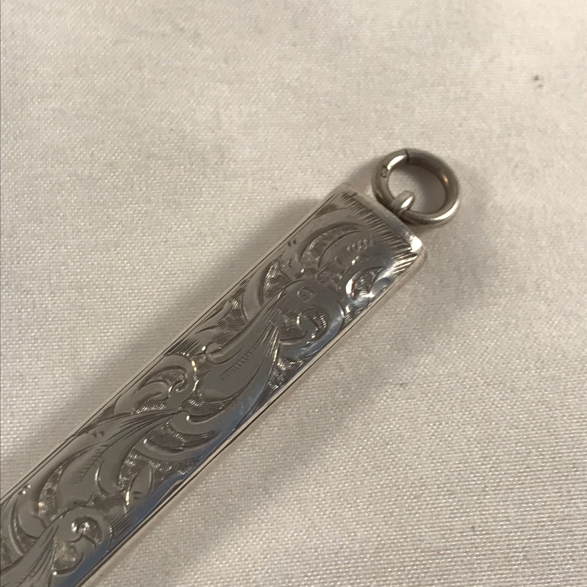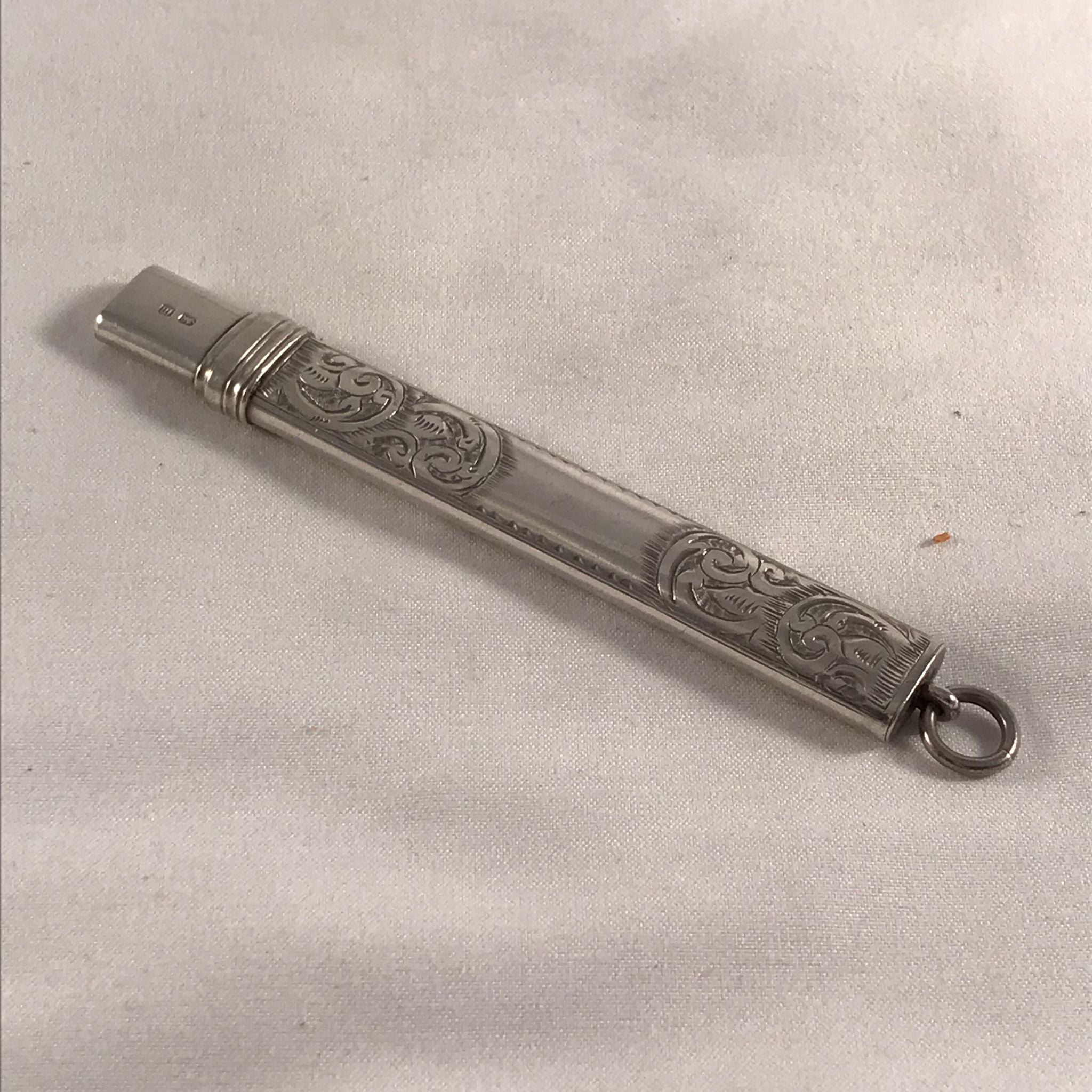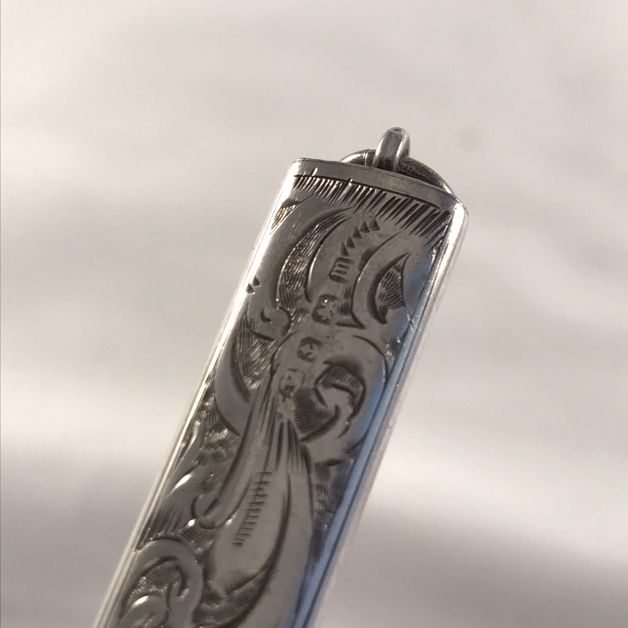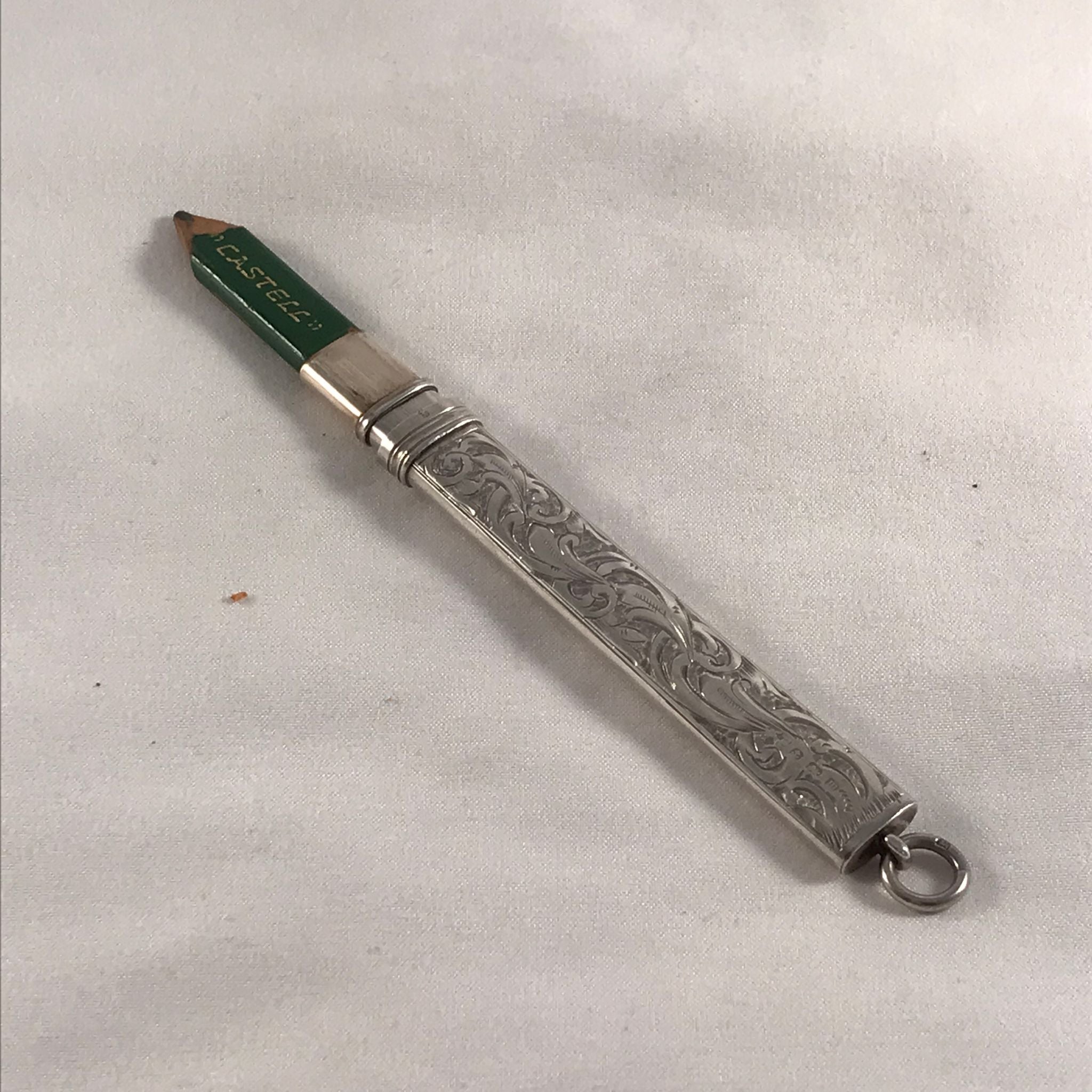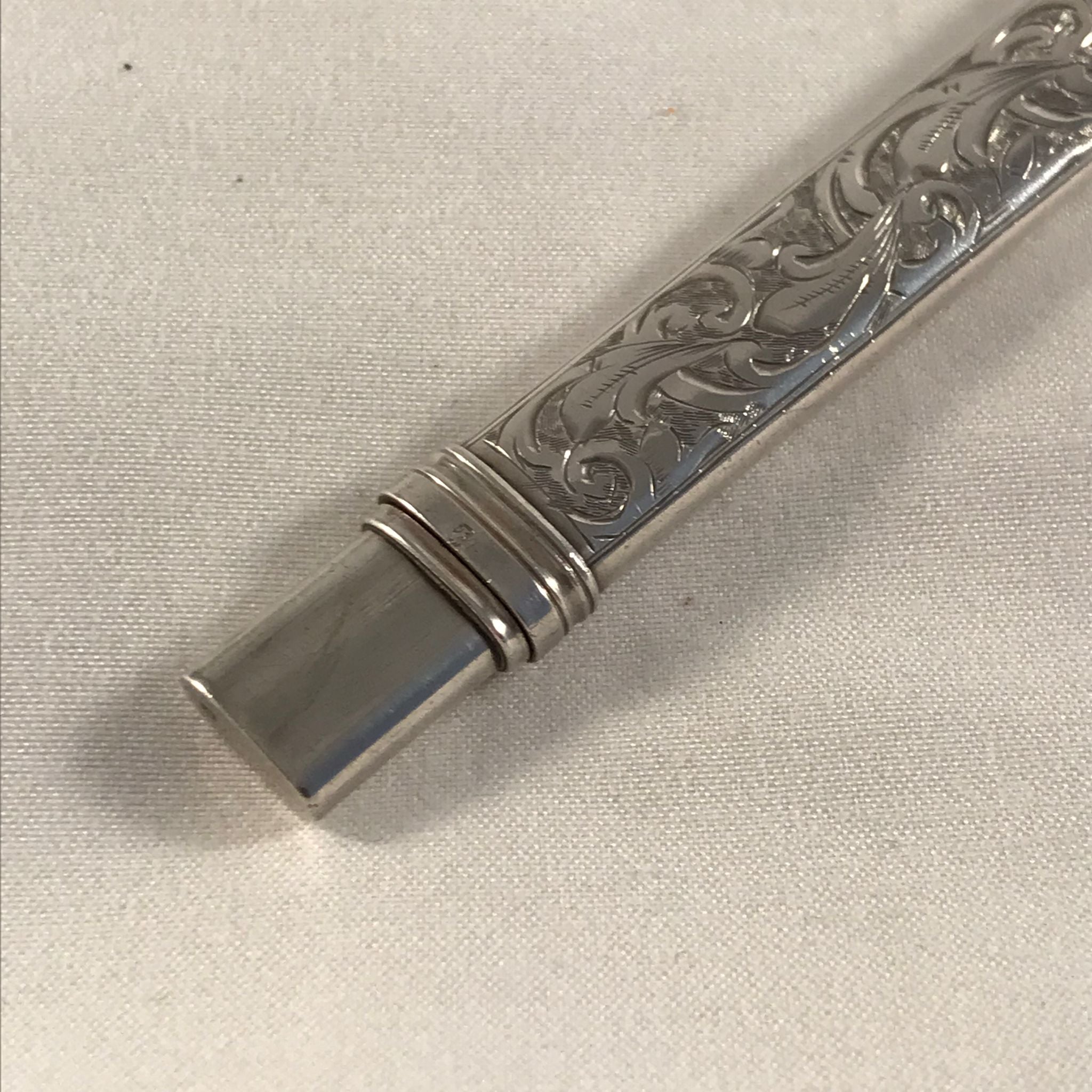 This silver pencil is in excellent condition without any damage. The decoration is crisp and undamaged. There are very minor marks commensurate with age and minimal use. The hallmarks are small and very slightly rubbed, the makers mark is unclear partly as it is enclosed within the engraved pattern. A lovely collectable silver item.