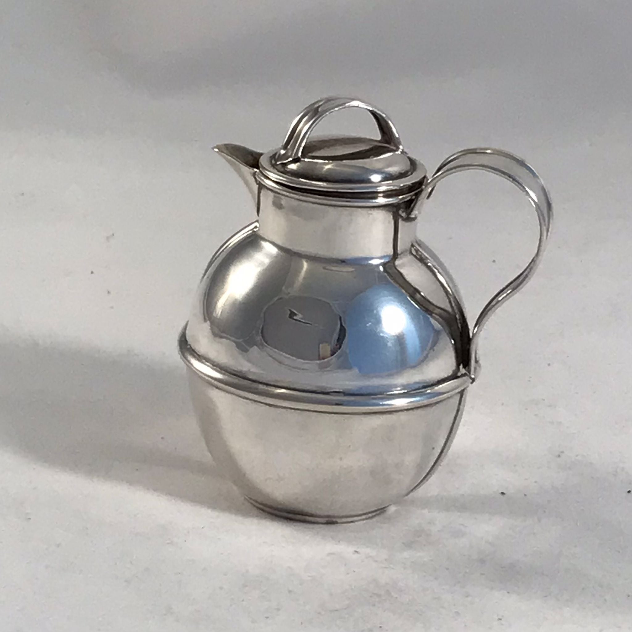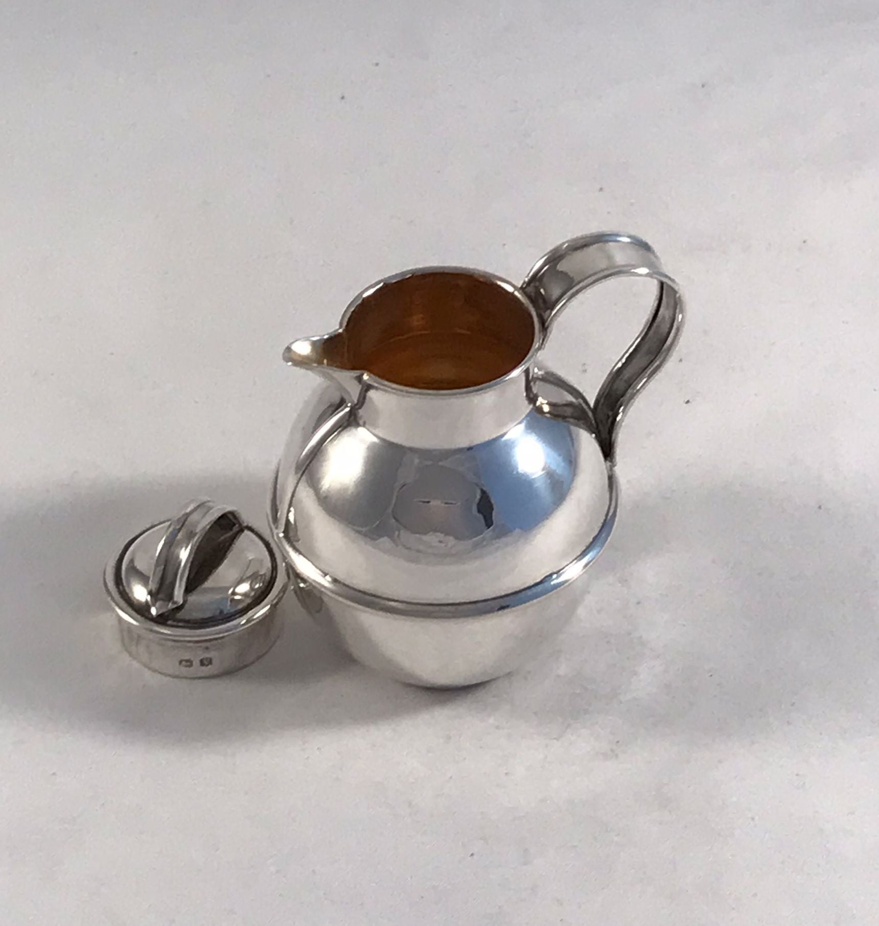 Excellent, there isn't any damage to this jug, the design and shape is still sharp, there is some very light and minor surface marks due to age and use which are commensurate with age and light use. There are some darker marks around the base - see pictures but again these are expected on a piece of this age. The lid is marked as would be expected of a quality piece of silver and the jug is gilded inside. The lid fits very well.
