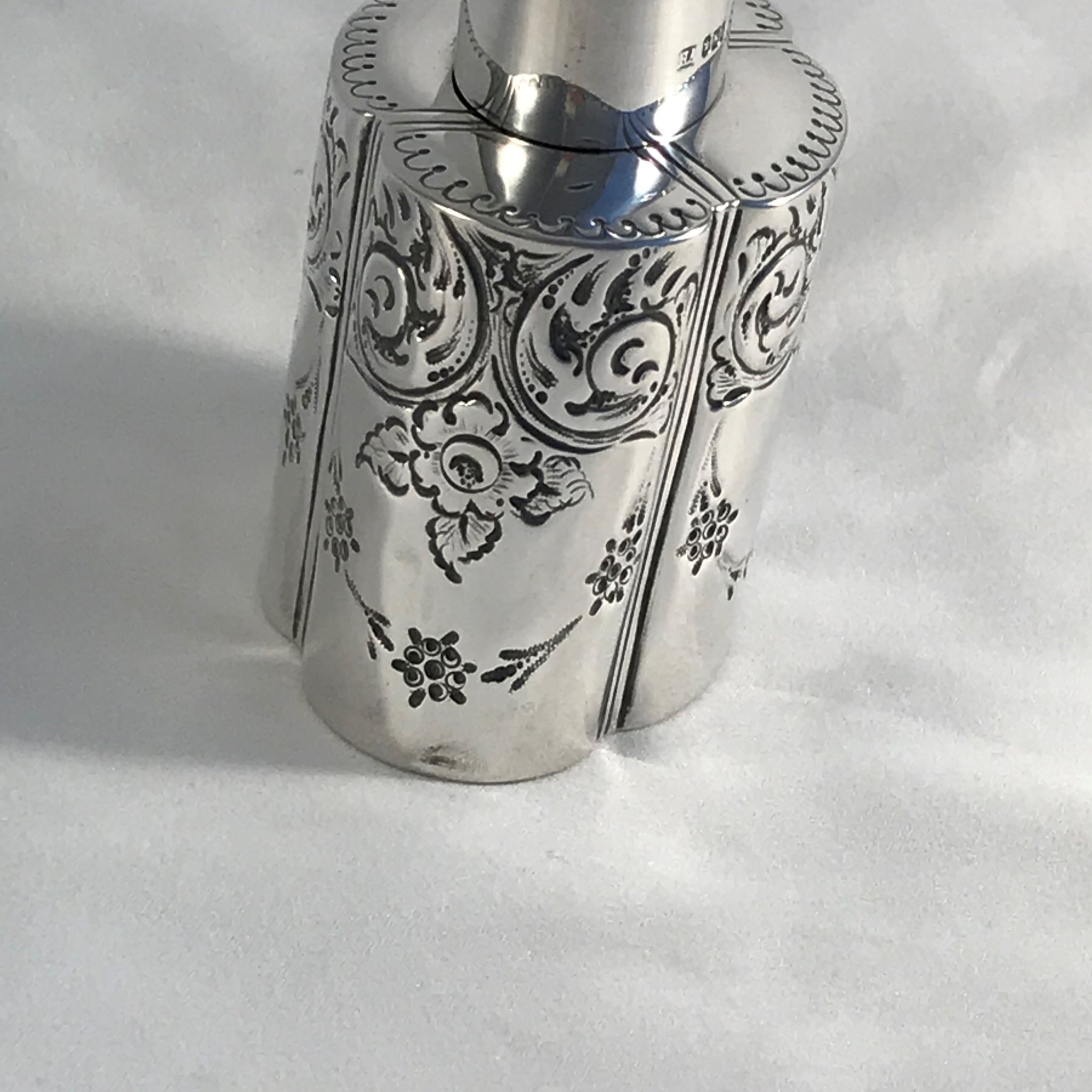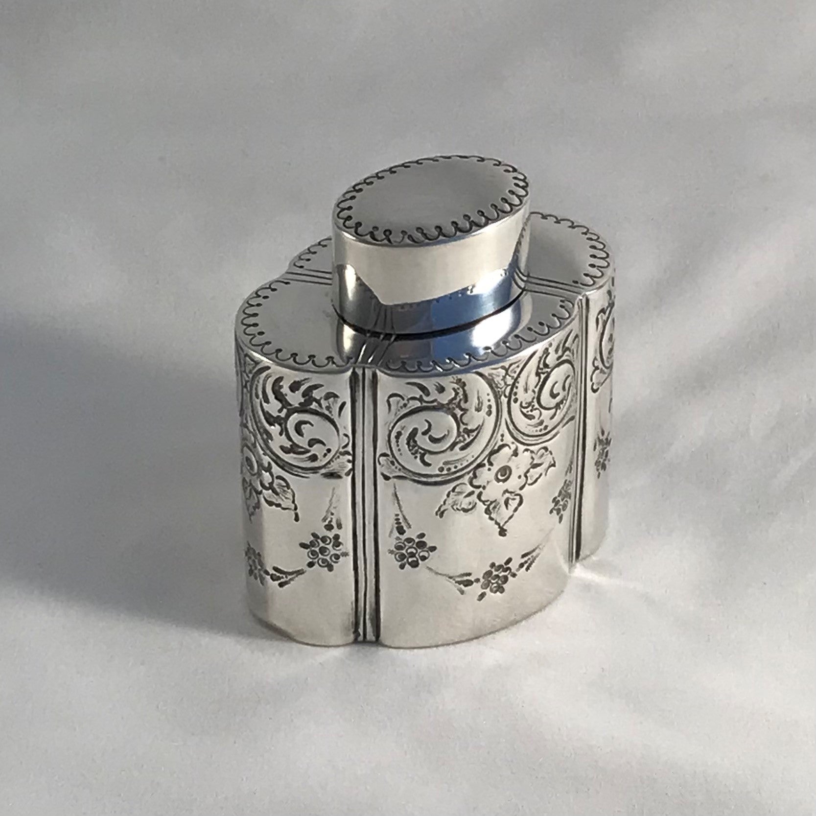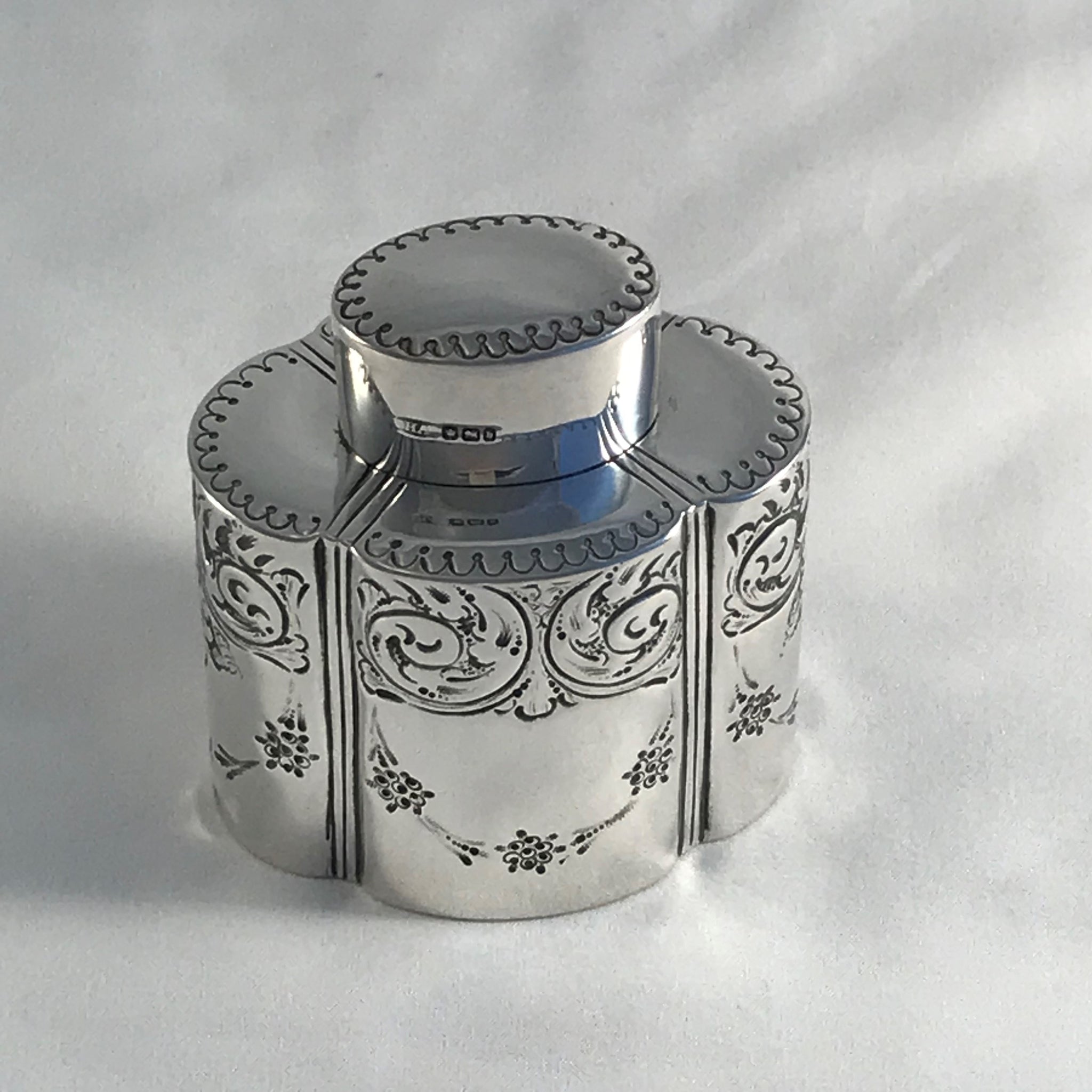 A really pretty Victorian silver Tea Caddy. This is a great quality piece of Victorian silver. It is quatrefoil in shape and decorated with an embossed decoration. The lid slides onto the base and is a good fit. A beautiful small silver Tea Caddy.