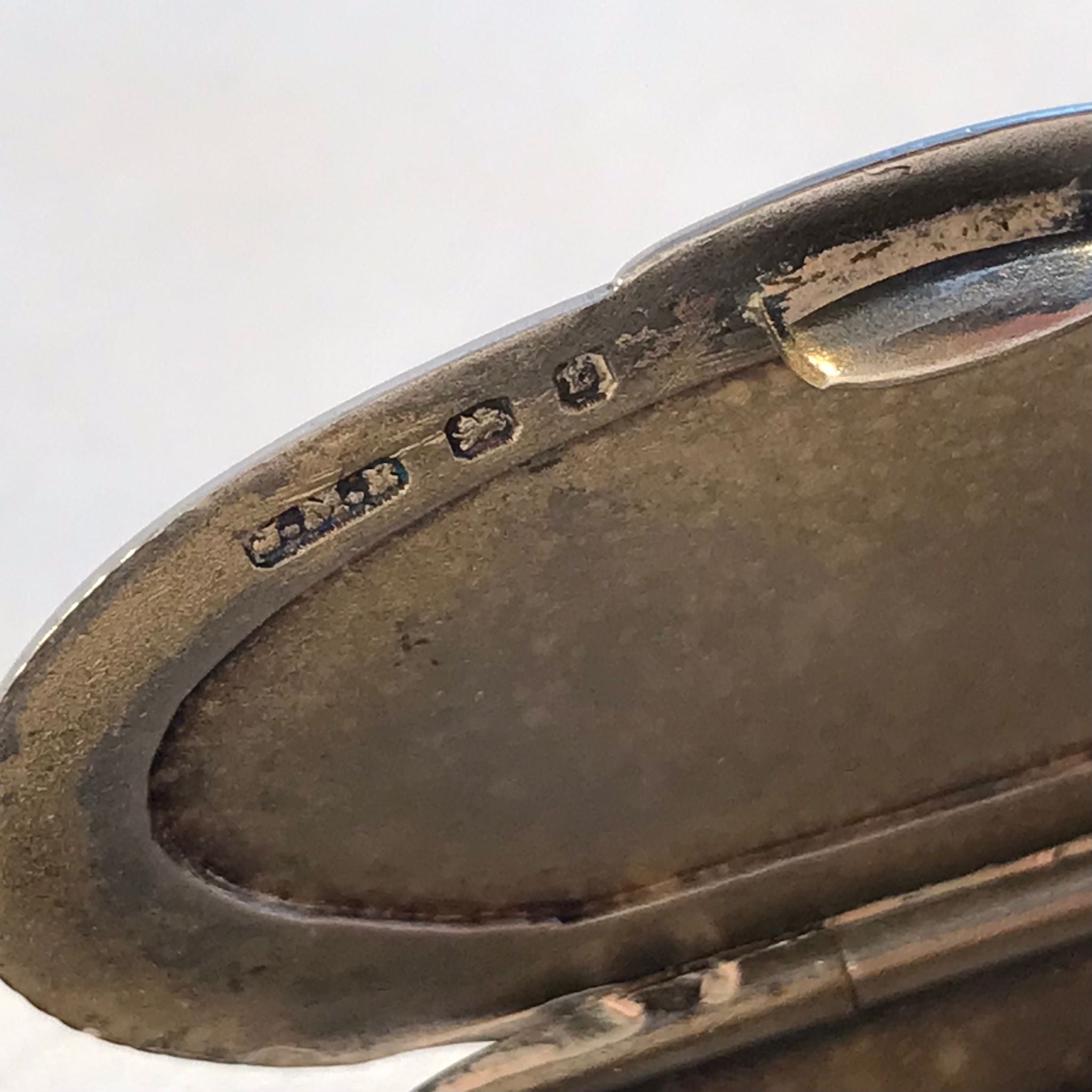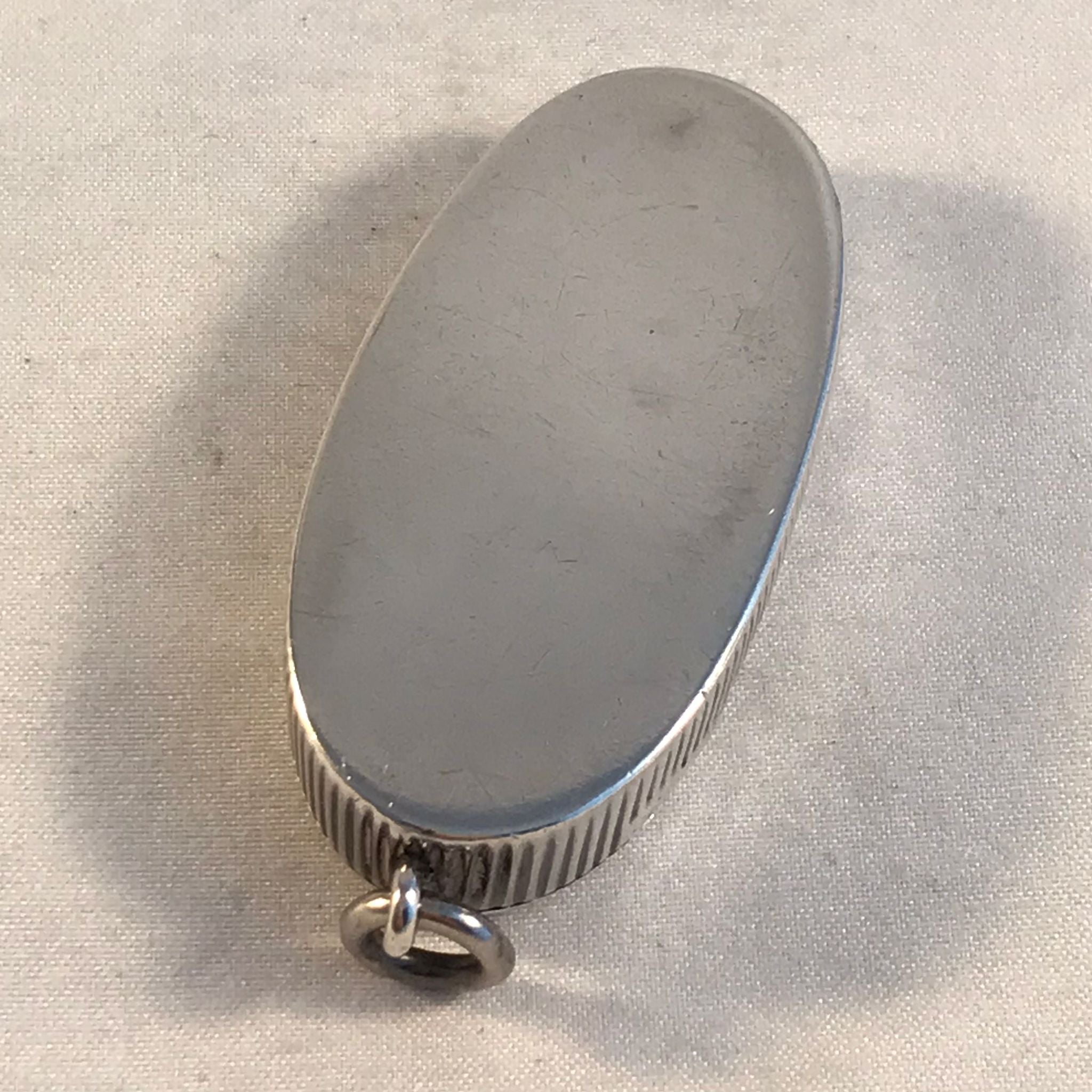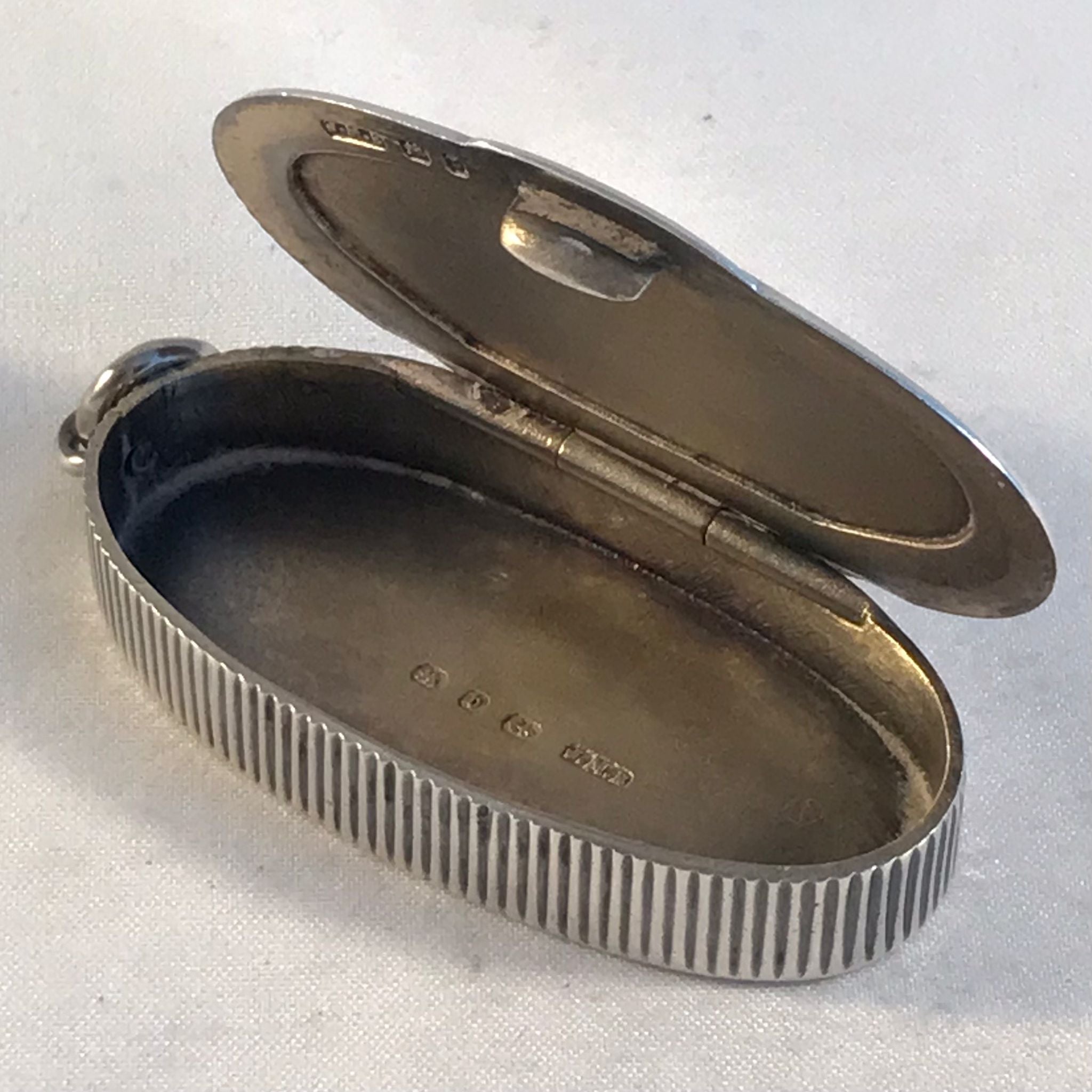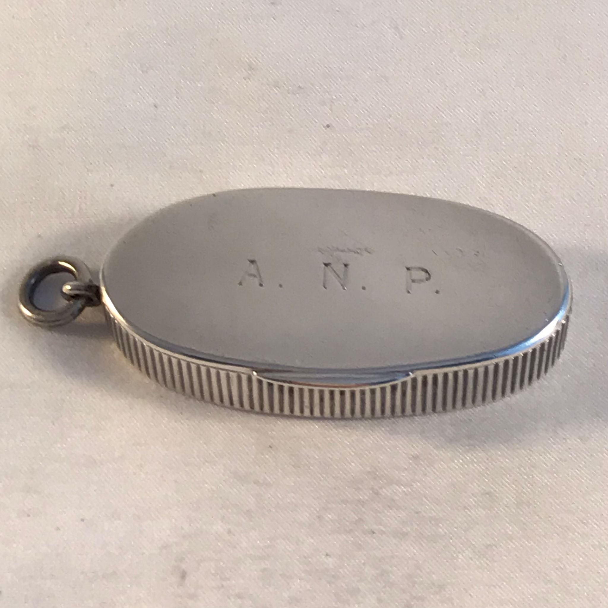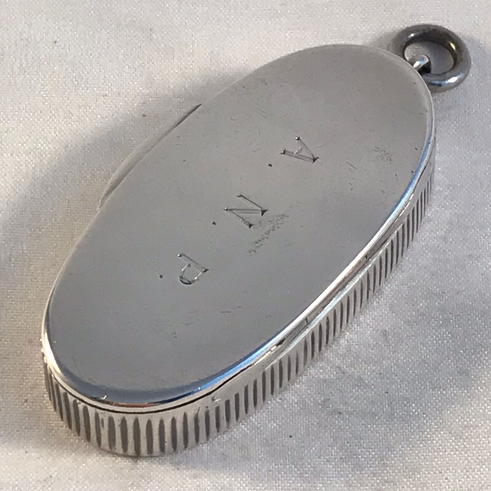 An unusual Victorian silver vesta or matchbox. This is oval in shape with a flip top lid and all round the edge is a ribbed striker. This is plain with no decoration but is engraved with initials to the centre. Clearly hallmarked on the underside of the lid and on the inside of the base. A very collectable silver vesta / matchbox.